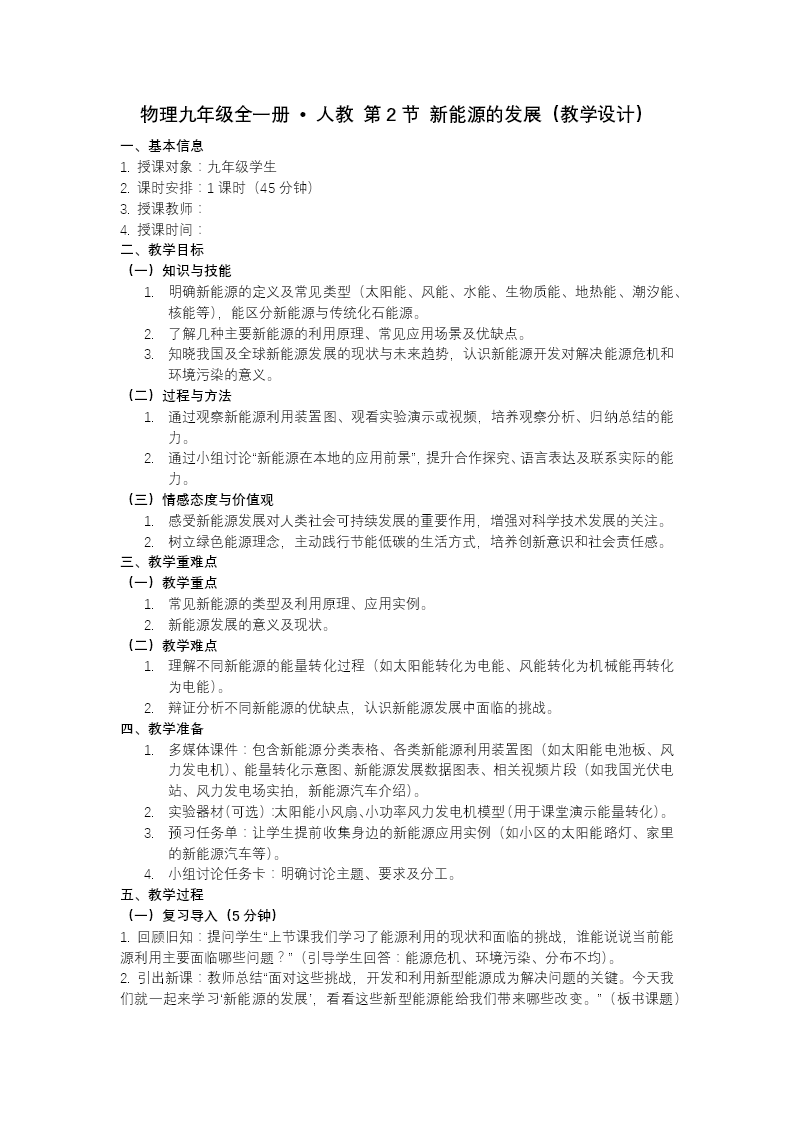 这是一套专为九年级物理“新能源的发展”主题设计的课件,内容聚焦于核能、太阳能等新能源的原理与应用,结构清晰、逻辑严谨,是“能源与可持续发展”章节的重点教学材料。 课件以“人类能否利用太阳能源”这一引人入胜的问题开篇,迅速吸引学生的注意力,并明确学习目标:了解新能源的类型,掌握核能和太阳能的基本原理及其应用。这种目标导向的设计让学生在学习过程中更有方向感。 在核心内容部分,课件首先深入讲解核能。从原子结构的基础知识入手,帮助学生理解核能的来源。课件详细区分了核裂变和核聚变两种核反应过程:核裂变是重核分裂释放巨大能量,广泛应用于原子弹和核电站;核聚变则是轻核聚合释放能量,是氢弹和太阳发光发热的基本原理。此外,课件还补充了我国核电发展的现状,让学生了解我国在核能领域的成就与挑战。 随后,课件转向太阳能的讲解。通过说明太阳通过核聚变发光发热的原理,引出太阳能的多种利用方式,包括光热转化(如太阳能热水器)、光电转化(如太阳能电池板)以及光合作用(植物利用太阳能进行生长)。此外,课件还简要提及了风能、海洋能等其他新能源,拓宽学生的知识面。 为了巩固学生对新能源知识的理解,课件穿插了多个学习任务和练习题,如核能利用、太阳能转化的选择题等。这些练习题形式多样,能够帮助学生更好地掌握课堂知识,同时也便于教师及时了解学生的学习情况。 最后,通过课堂小结梳理核心内容,帮助学生系统回顾所学知识。课件还布置了拓展作业,要求学生分析核能发电的利弊,鼓励学生从多角度思考问题,培养他们的批判性思维和综合分析能力。 整套PPT兼顾理论讲解与实际应用,不仅帮助学生深入理解新能源的原理与应用,还通过练习和拓展作业提升了学生的思维能力和知识运用能力,是九年级物理“能源与可持续发展”章节的优质教学材料。