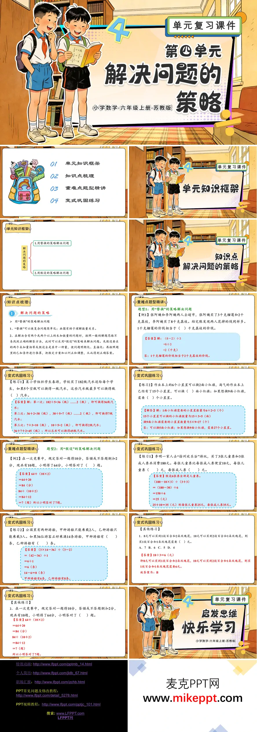 这份苏教版六年级上册数学复习PPT,把第三、四单元装进同一套“骨架”——先搭知识框架,再梳知识点,接着精讲重难点,最后用变式练习锁分,结构清、节奏快,六年级学生一眼就能跟上。 第三单元“分数除法”一上来甩出思维导图:分数除法→乘倒数→乘除混合→解方程→比的意义→比的基本性质→按比分配,六大模块一字排开,重点用红底白字闪三次。梳理环节把计算口诀编成“一找倒数二变乘三约分”,配口算快闪:屏幕每秒蹦一道÷2/3、÷4/5,学生口答倒数同时出现,节奏感堪比rap。重难点精讲聚焦“乘除混合”和“按比分配”:例1“2/3千克菜籽榨1/4千克油,1千克菜籽榨多少油?”用“单位量”思想拆两步,先求1千克油需菜籽再倒数,学生秒懂“倒数不倒目标”。变式练习立刻甩出“榨油机升级版”——出油率变为3/5,菜籽量变为未知数,设方程解x,口算→笔算→方程三级跳,知识当场迁移。 第四单元“解决问题的策略”切换成生活剧场。知识框架只树两根支柱:替换、假设。精讲用“购物风波”开场:3支钢笔+2本笔记本共28元,钢笔比笔记本贵2元,求单价。教师先示范“替换”——把钢笔全换成笔记本,总价减6元,再平均分给5件;再示范“假设”——假设全买笔记本,总价20元,差价8元,用“多退少补”调回真实价。两种策略同框出现,学生直观看到“复杂问题被折叠成一步加减”。紧接着变式练习上线:汽水“5空瓶换1瓶”、公园“团体票vs单人票”、竞赛“对1题+5分错1题-2分”三种场景,每题配“策略选择按钮”,学生先投票用替换还是假设,系统再播放对应解题动画,做对奖励“策略徽章”,累计三枚解锁“小小策略家”称号。整套PPT用“框架图—口诀—生活例—游戏式变式”四连击,让分数除法不再怕倒数,解决问题不再靠蒙猜,六年级复习也能高效又有趣。