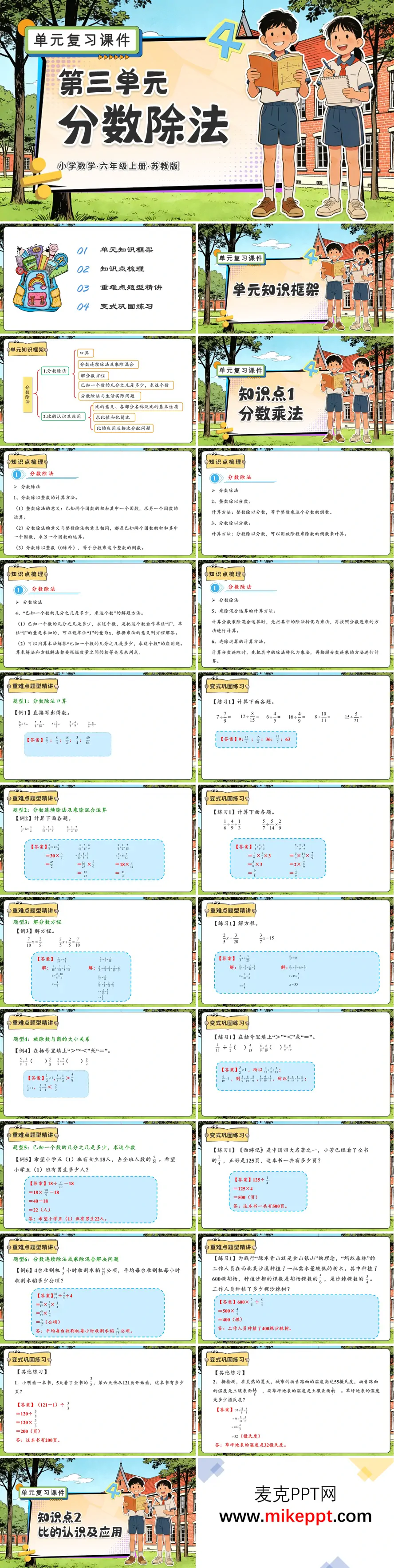 这份苏教版六年级上册第三单元“分数除法”复习PPT,用“框架—梳理—精讲—变式”四步闭环,把原本容易“倒数倒错、比号写反”的痛点一次扫清。开篇知识框架把全单元拆成左右两大模块:左边“分数除法”从口算、乘除混合到解方程,右边“比的认识”从意义、性质到按比分配,一条箭头把“除法→比→分配”串成逻辑链,学生一眼看懂“先学会倒,再学会分”。 知识点梳理用“口诀+色块”双通道输入:计算法则浓缩成“除号变乘号,倒数立刻到”,用红底白字闪三次;关键句“已知一个数的几分之几是多少,求这个数”配蓝色便利贴,旁边再画放大镜,提示“单位1”就是“被除数”,把抽象数量关系变成“找1→列式→倒→乘”三步走。比与除法、分数的关系做成“三胞胎”表格,同一行里“3∶4=3÷4=3/4”,点击出现动画高亮,学生秒懂符号不同、意义相通。 重难点精讲环节,教师先播30秒“口算快闪”:屏幕随机蹦出÷2/3、÷4/5,学生抢答倒数,答对出现“火箭升空”特效,课堂氛围瞬间拉满。接着用四道典型例题层层升级:①口算÷3/4,强化倒数;②乘除混合“2/3×5/8÷5/6”,教“先乘后倒”与“一次性倒”两种算法,让学生自选捷径;③解方程“3/4 x=9/10”,用“倒数法”与“两边同乘”双轨板书,比较哪种更省事;④按比分配“奶茶粉和牛奶按2∶9调配,550 g奶茶需要多少奶?”把比转化成分数再乘总量,生活场景让“比”不再抽象。每题右侧留“易错警告”:忘倒数、除数分子分母颠倒、比的前后项写反,红色闪电标重点。 变式巩固练习分三级:A级基础算——12道分数除法口算,限时2分钟,系统自动批改;B级综合——“榨油率”“行程问题”两大道应用题,要求学生先画线段图再找“单位1”;C级拓展——“配制果汁”“调配涂料”按比开放题,答案不唯一,鼓励用不同策略验证。整套课件用“快闪—动画—生活—游戏”四连击,让倒数不再头疼、比号不再写反,六年级学生也能在轻松节奏里把分数除法吃透拿稳。