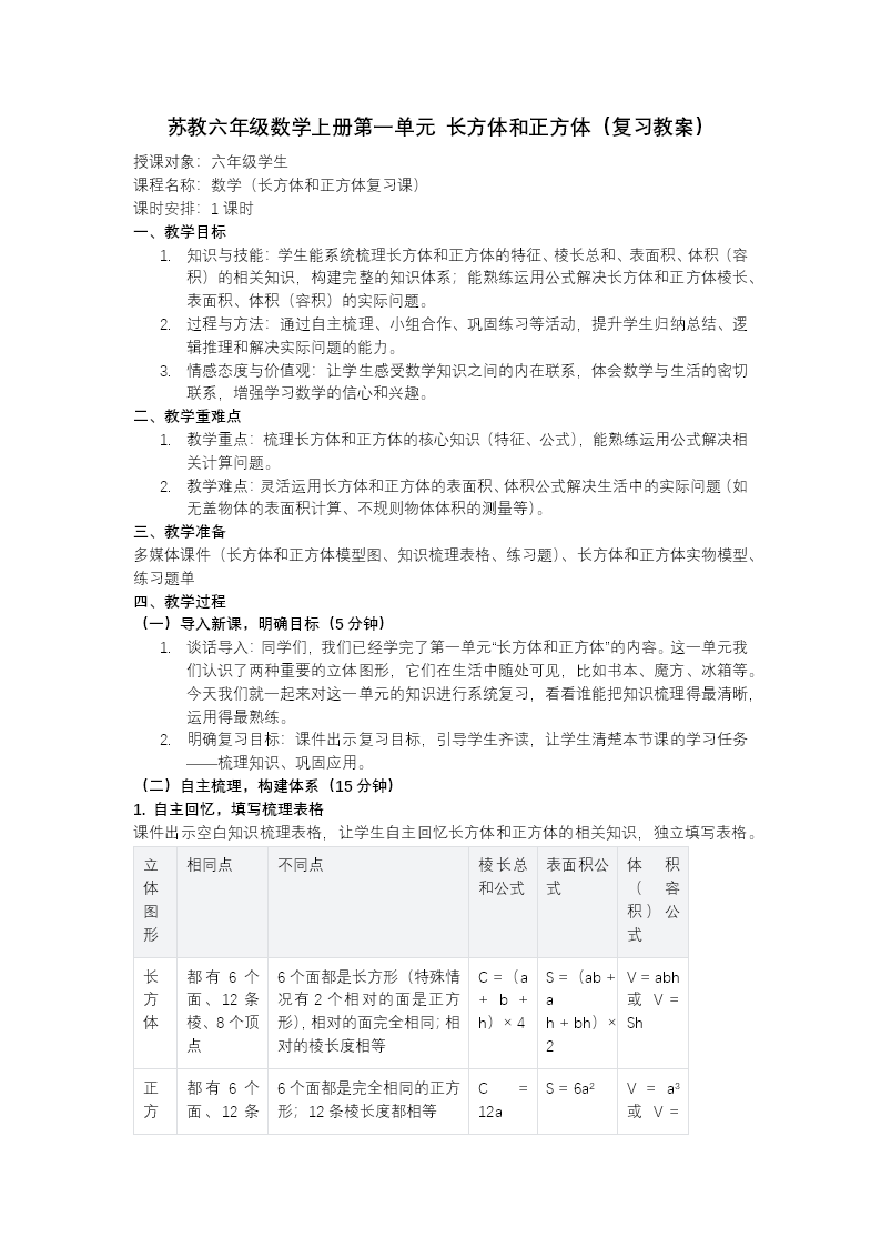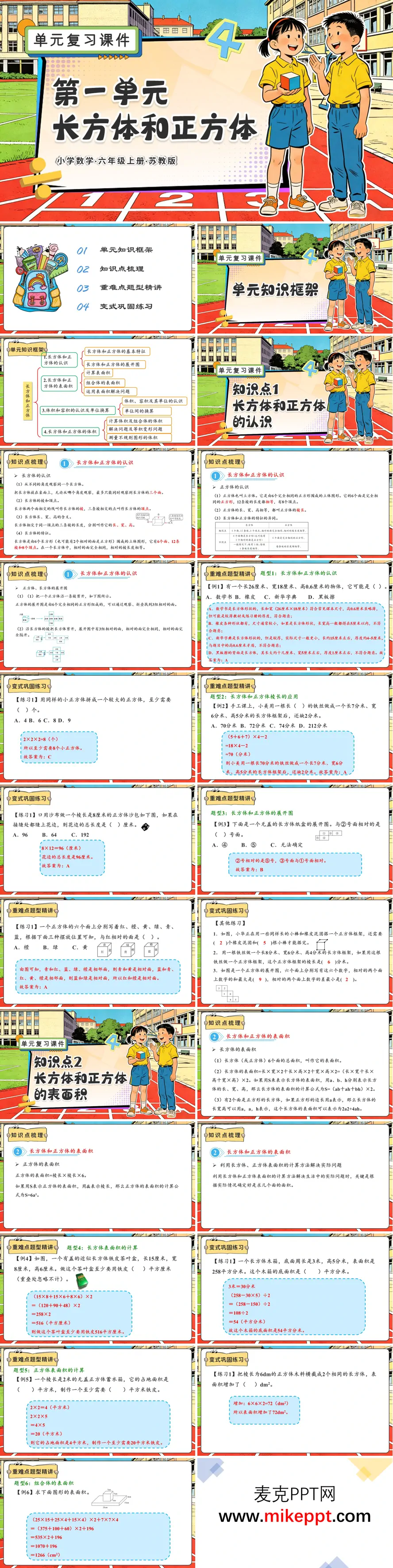 这份苏教版六年级上册数学复习PPT把“空间几何”与“策略解题”装进同一套四步引擎:框架图—知识清单—重难精讲—变式练兵,让第一单元的长方体、正方体和第四单元的“替换-假设”策略在课堂里无缝衔接。 开篇“长方体和正方体”模块先用一张爆炸视图把五大核心知识点排成立体航线:①特征与展开图—②表面积—③体积容积—④组合体与不规则体—⑤单位进率,学生像搭积木一样逐级解锁。知识梳理环节把“棱长总和、表面积、体积”三大公式做成可拖拽的“公式魔方”,输入长、宽、高即刻生成展开动画,学生一眼看到“多一条高就多一圈侧面积”。重难点精讲先上“生活痛点”:快递箱如何用最省包装纸?屏幕给出三种摆法,学生现场口算表面积,系统实时显示“省纸排行榜”,再把最佳方案放大,引出“重叠越少越省料”的环保理念;体积部分则用“水位上升法”测不规则土豆,量筒动画同步上升,学生读出刻度就能套用V=Sh,把实验搬进PPT。变式练习分三级:A级口算棱长总和、表面积、体积公式;B级综合“鱼缸包边、刷漆、灌水”三连问,一题三考;C级拓展“组合领奖台”需切、补、挖多种操作,答案用3D旋转验证,空间观念在动手中固化。 切换到第四单元“解决问题的策略”,场景立刻从立体实验室来到生活大卖场。知识框架只树两根支柱:替换、假设。精讲用“购物风波”揭幕:3支钢笔+2本笔记本共28元,钢笔比笔记本贵2元,教师先示范“替换”——把所有钢笔换成笔记本,总价自动减6元,再均分;再示范“假设”——假设全买笔记本,总价20元,差额8元用“多退少补”调回真实价,两种策略同框对比,学生直观看到“复杂问题被折叠成一步加减”。变式练习继续升级:汽水“5空瓶换1瓶”、公园“团体票vs单人票”、竞赛“对1题+5分错1题-2分”,每题配“策略选择器”,学生先投票用替换还是假设,系统再播放对应解题动画,做对即得“策略徽章”,集齐三枚解锁“小小策略家”称号。 整套PPT用“立体-平面-策略”三幕剧形式,让公式不再冰冷、策略不再抽象:上午刚算完鱼缸能装几升水,下午就用假设法算出买汽水怎样最省钱,六年级学生在“空间想象+生活策略”的双轮驱动下,复习课也能津津有味、高分稳拿。