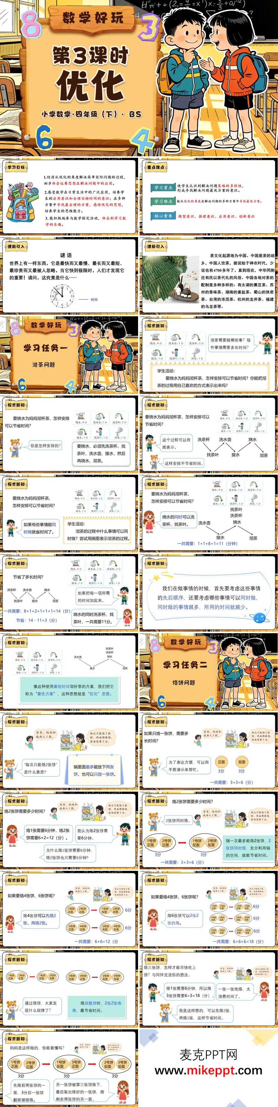 这份北师大版四年级下册“数学好玩”PPT打包了两节“实践味”十足的课堂:先带学生去奥运赛场算成绩,再回教室沏茶烙饼省时间,让“小数运算”与“统筹优化”在同一文件里无缝衔接。 第一课时“奥运中的数学”直接把课堂搬进体育场。开幕短片过后,大屏亮出刘翔110米栏三枪成绩:12.95秒、12.88秒、12.91秒,学生秒算差值,复习小数加减;射击决赛环节,用3D视角旋转靶位,让学生判断“哪幅图是裁判看到的”,空间观念在线升级;跳水比赛则给出五轮得分,先去掉最高最低再求平均,练习小数混合运算并与排名挂钩。每答对一次,系统升起对应国旗、播放国歌,实时积分榜把小组名字挂上“领奖台”,数感、数据意识和应用意识在呐喊声中悄悄拔节。 第二课时“优化”切换到生活实验室。教师先放2分钟“沏茶乱象”:接水、烧水、找茶叶、洗杯子串行进行,共花15分钟,再播放“并行版”——烧水同时洗杯、找茶叶,只需8分钟,时间条瞬间缩短,学生惊呼“原来可以同步”。接着进入“烙饼工坊”:一只锅最多放2张饼,每面3分钟,3张饼最少几分钟?学生用磁性饼模型现场试验,发现“交替烙、不空锅”9分钟最优,系统用甘特图动态演示,让“运筹”二字看得见。达标练习立刻上线:A级基础——再给4张饼、5张饼求最少时间;B级应用——设计“早晨起床流程图”,比一比谁的方案用时最短;C级拓展——查阅“快递员路线优化”,下节课分享。课后作业分层布置,确保每个孩子都能把“优化”思想带回家,合理安排自己的学习与生活。 整套课件用“赛场算小数—生活省时间”两条线,让四年级学生真切感到:数学不是枯燥符号,而是藏在奥运跑道和早晨厨房里的大智慧。