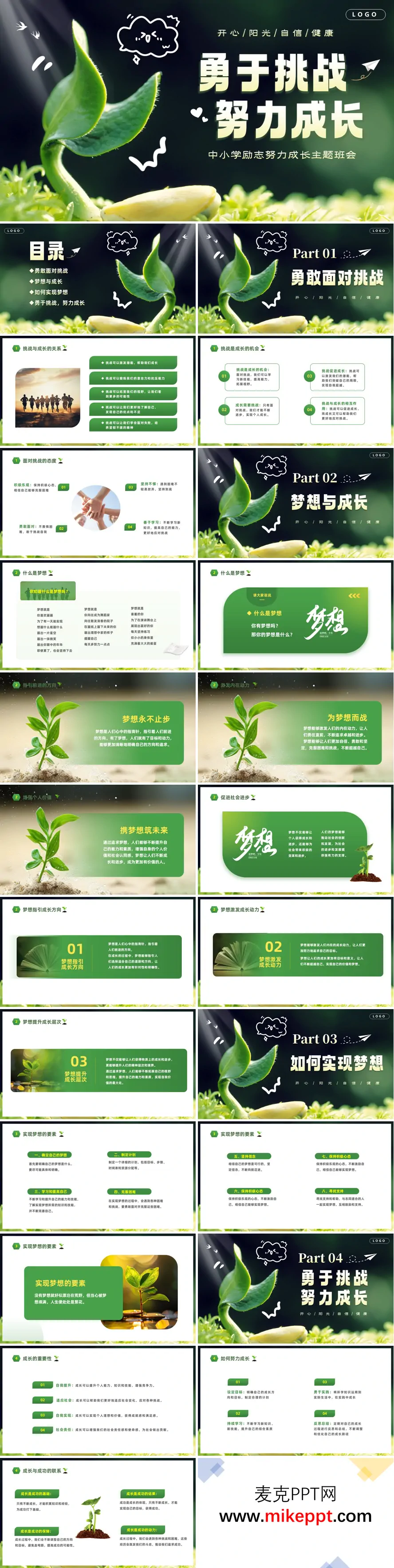这是一套专为中小学励志主题班会设计的课件,主题为“勇于挑战,努力成长”,整体视觉风格以清新绿色植物为基调,象征着生机与成长,分为四大板块。 第一板块聚焦于“勇敢面对挑战”,深入剖析挑战与成长之间的紧密联系。挑战并非阻碍,而是成长的契机,它能磨砺我们的能力,增强我们的韧性。课件中还向学生传递了积极面对挑战的态度,包括乐观、勇敢、坚持和不断学习,鼓励学生在面对困难时迎难而上。 第二板块围绕“梦想与成长”展开,引导学生深入理解梦想的内涵。梦想对个人而言,是前行的方向指引,是奋斗的动力源泉;对社会来说,是推动进步的重要力量。课件强调梦想是成长的核心指引,让学生明白梦想的重要性。 第三板块探讨“如何实现梦想”,提供了具体可行的方法。从认清自身优势与不足,到制定切实可行的计划,再到不断学习提升,以及保持信心、积极寻求支持等。课件特别强调“没有行动的梦想只是空想”,鼓励学生将梦想付诸实践。 第四板块回归主题“勇于挑战,努力成长”,阐述成长的意义,包括提升自我和为社会贡献力量。同时,给出成长路径:设定目标、持续学习、敢于尝试、善于反思,并再次强调勇敢和坚持是突破挑战、实现成长的关键。整套课件逻辑清晰,既有理念引导,又有实操方法,非常适合中小学班会的励志教育需求。