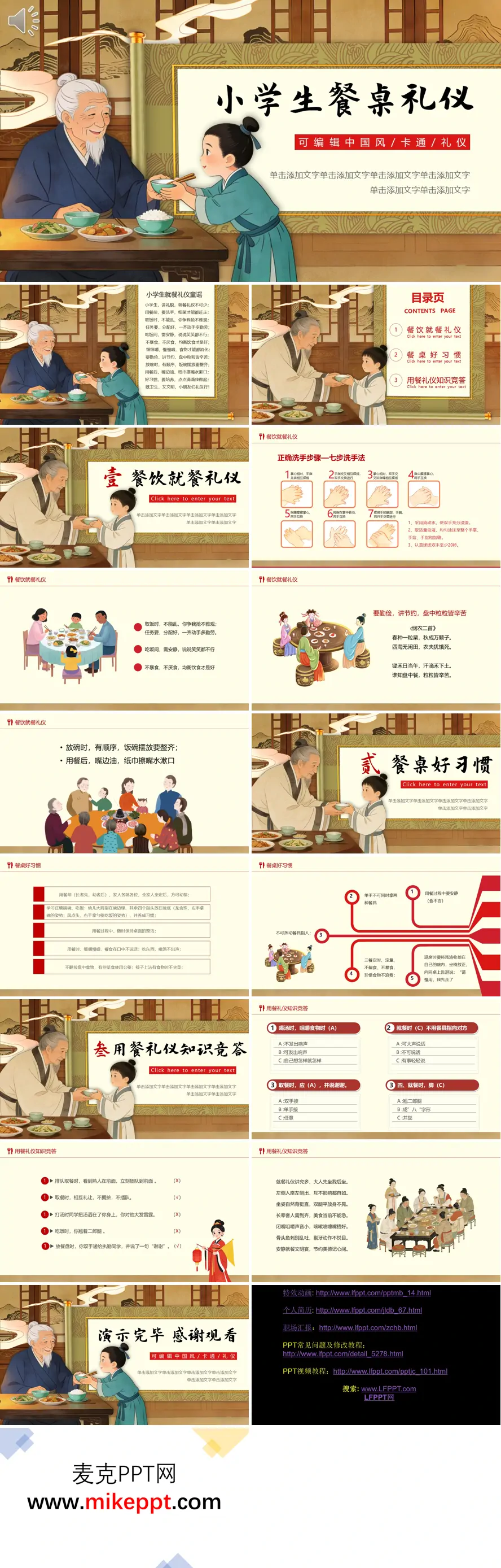 这是一套专为小学生设计的“餐桌礼仪”主题课件,采用中国风卡通风格,将传统文化与童趣设计完美结合,分为三大板块,旨在帮助小学生养成良好的用餐礼仪习惯,兼具实用性和趣味性。 第一部分为“餐饮就餐礼仪”,从餐前准备开始,详细讲解七步洗手法,引导学生养成卫生习惯。随后,课件明确了就餐过程中的行为规范,如取餐时要礼让他人、吃饭时不喧哗、不挑食偏食,并巧妙融入《悯农》诗句,传递节约粮食的理念。此外,还补充了放碗有序、餐后擦嘴等细节,帮助学生树立文明用餐的意识。 第二部分“餐桌好习惯”进一步细化用餐礼仪。课件强调用餐时需等长辈先动筷,保持坐姿端正,咀嚼时不发出声响。同时,列出了一些常见的用餐禁忌,如不敲餐具、不翻捡食物等,通过条理清晰的规则,帮助学生养成文明的餐桌习惯。 第三部分“用餐礼仪知识竞答”通过选择题、判断题等互动形式,让学生在轻松愉快的氛围中巩固所学内容。最后,课件用简洁易记的口诀总结核心礼仪要点,帮助学生更好地记忆和运用。 整套课件以传统国风插画搭配童趣设计,既传递了中华传统礼仪文化,又贴合小学生的认知特点,非常适合在小学礼仪教育中使用,能够有效引导学生在日常生活中践行文明礼仪。
