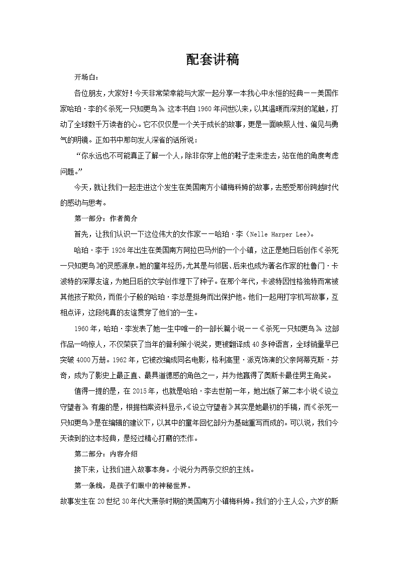 这是一套关于经典文学作品《杀死一只知更鸟》的阅读分享课件,以美国作家哈珀・李的这部杰作为核心,分为五大板块,全面深入地展开分析,适合用于文学阅读分享场景。 课件以作品中的经典名言开篇,迅速吸引读者的注意力并引入主题。在第一部分“作者简介”中,详细介绍了哈珀・李的生平与创作历程,强调《杀死一只知更鸟》作为其代表作所取得的巨大销量和深远影响力,为读者奠定对作品的初步认知。 第二部分“内容介绍”以简洁清晰的脉络梳理了小说的故事主线。通过小女孩斯库特的纯真视角,讲述了父亲芬奇律师为黑人汤姆辩护的案件,以及小镇上关于“怪人”拉德利的神秘传闻。这一部分不仅展现了人物的成长历程,也揭示了作品所反映的社会矛盾。 第三部分“创作背景”深入挖掘了作品与美国20世纪种族隔离时代的紧密联系。结合哈珀・李的个人经历,帮助读者理解小说背后的历史与社会语境,为后续的深度解读奠定基础。 第四部分“人物介绍”聚焦于小说中的核心角色。课件细致解析了斯库特的纯真视角如何贯穿全书,芬奇律师的正义形象如何成为道德标杆,以及“怪人”拉德利的隐喻性设定,展现了人物的多面性和作品的深刻内涵。 第五部分“作品鉴赏”则提炼了小说的核心主题。课件点明“知更鸟”象征着无辜者,通过斯库特的成长故事,作品深刻批判了种族歧视,探讨了人性与正义的永恒主题。这一部分不仅帮助读者深入理解作品的文学价值,也引发了对社会现实的思考。 整套课件逻辑清晰,从基础信息到深度解读,层层递进,既适合初读作品的读者快速把握全貌,也能为深入研究者提供丰富的分析视角,是一份兼具知识性与启发性的阅读分享课件。