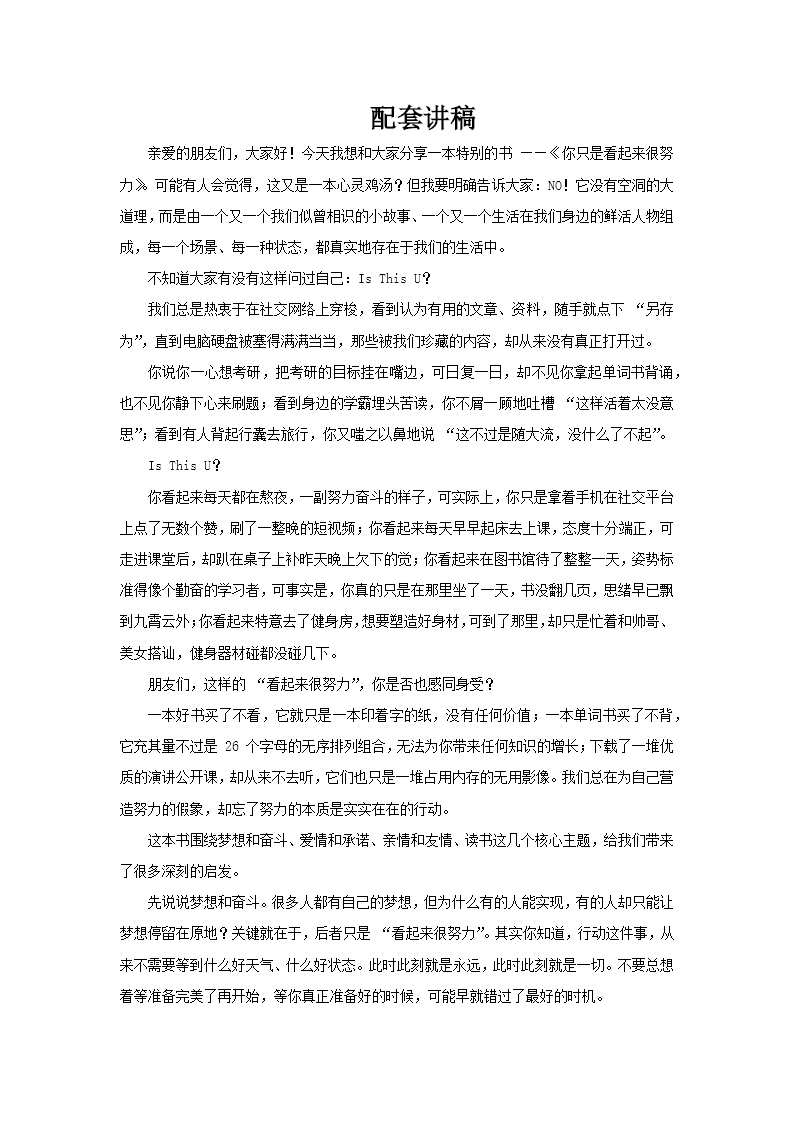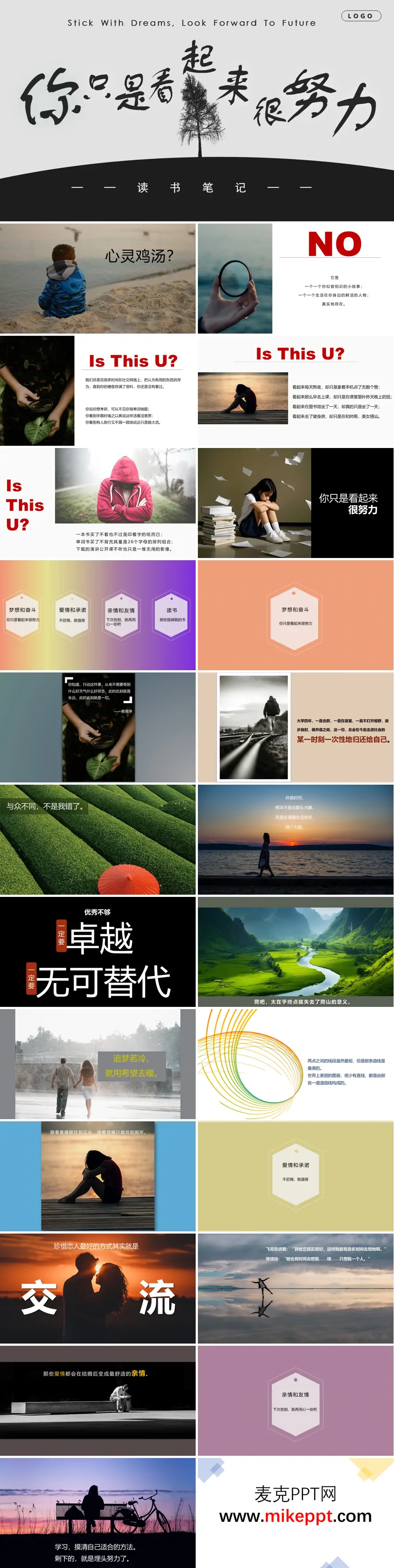 这是一套关于《你只是看起来很努力》的读书分享课件,以“伪努力”现象为切入点,结合生活场景与感悟展开内容,旨在引导青年群体反思自我,实现真实成长。 课件开篇明确指出,这本书并非简单的“心灵鸡汤”,而是聚焦于身边真实存在的“伪努力”案例。例如,那些看似忙碌却效率低下的行为,或者假装学习却心不在焉的状态。通过提问“Is This U?”(这是否就是你?),迅速引发读者共鸣,直击问题本质。 核心内容围绕梦想、爱情、亲情、读书四大维度展开深入反思。课件戳破了“看似努力”的自我欺骗,强调真正的努力需要找准方法、踏实行动。同时,穿插了诸多成长感悟,如“优秀只是起点,卓越到无可替代才是目标”“追梦路上难免寒冷,但要用希望温暖自己”,传递出一种踏实奋进的态度。 此外,课件还融入了对人际关系的思考。在亲情方面,提醒人们珍惜与家人相处的时光;在友情中,强调真诚的重要性;而在爱情里,倡导通过有效沟通来维系关系。同时,对于读书,课件提醒读者应追求深度而非仅仅停留在形式上。 整套课件以文艺的图文搭配,营造出浓厚的氛围,从对“伪努力”的警醒过渡到对真实成长的指引。它不仅适合青年群体的自我认知与成长分享,也能为那些在迷茫中挣扎的人提供一份清晰的指引,帮助他们走出“伪努力”的困境,迈向真正的成长之路。