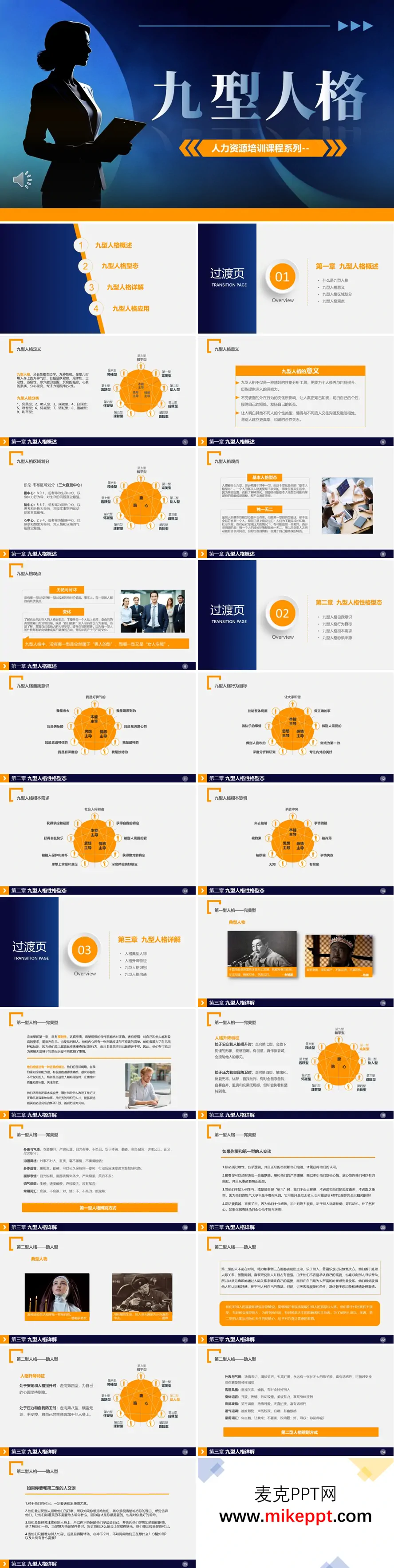 这套九型人格培训PPT通过系统化的框架,全面介绍了九型人格理论的核心内容与应用方法。文档开篇以清晰的章节划分引导读者从概念理解逐步深入到实际应用,每个部分都配有典型人物案例和形象化的图片,增强了内容的直观性和说服力。例如,在介绍第一型完美型人格时,配以朱镕基和包拯的形象,并引用其名言,生动诠释了该类型坚持原则、追求完美的特质。 PPT内容结构严谨,首先从九型人格的定义与区域划分入手,阐明其作为性格分析工具的意义,强调人格型态的稳定性与独特性。随后逐一对九种人格型态进行详解,包括其典型人物、行为特征、升降状态及沟通要点。例如第二型助人型以德蕾莎修女和雷锋为例,突出其乐于付出、重视关系的倾向;而第三型成就型则通过乔丹、埃里森等人物,展现其目标驱动、追求成功的特质。 文档最后部分聚焦于实际应用,通过表格对比各类型的注意力焦点与内在价值观,并针对不同人格的潜在客户提出沟通策略,体现了理论向实践的转化。整体来看,PPT内容层次分明,图文结合紧密,既具备理论深度,又通过人物案例和实操建议提升了实用价值,适合人力资源培训场景下的学习与推广。