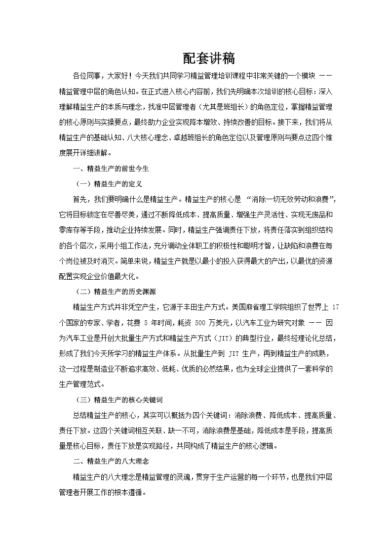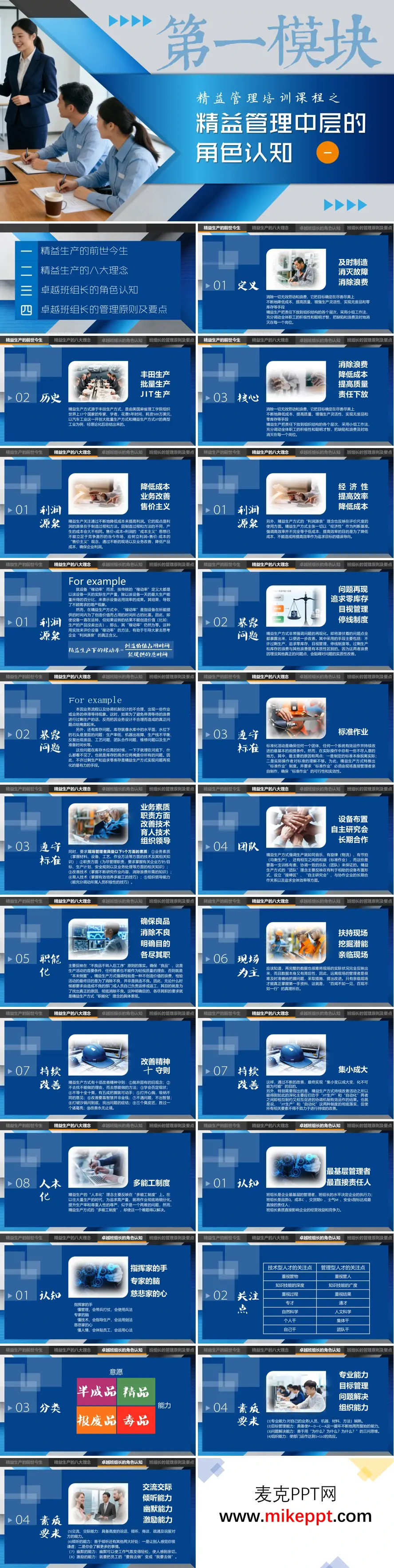 这份PPT系统地阐述了精益管理体系中班组长这一关键角色的认知与职责,同时深入解析了精益生产的核心理念。内容主要分为两大部分:精益生产的基础理论,以及卓越班组长的角色定位与管理实践。 在精益生产部分,PPT首先追溯了其起源于丰田生产方式的历史,并提炼出八大核心理念。这些理念包括将降低成本视为利润的真正源泉,而非简单提高售价;通过追求零库存和目视管理等手段主动暴露问题,而非掩盖问题;强调制定并严格遵守现场可行的标准作业;发扬团队协作精神;实现质量控制的职能化,确保不良品不流入后工序;倡导管理者以现场为主,亲临一线;推崇持续改善的文化,通过集小成大实现进步;最后是通过人本化的多能工制度,尊重并激发员工潜能。 在卓越班组长部分,PPT将其定位为企业最基层、最直接的管理者和责任人。一个卓越的班组长需要具备复合型人才的特质,如同指挥家的手(懂管理)、专家的脑(懂技术)和慈悲家的心(懂人情)。PPT详细列出了班组长的多项素质要求,如专业能力、目标管理、问题解决能力等,并强调了其管理原则:要具备全局视野,善于反省,并坚持“现场、现物、现实”的实干作风。最后,PPT还提供了非常具体的日常管理要点,涵盖了利用4M1E法进行班前准备、班中七项关键控制点以及班后交接的“三不交、三不接”原则,极具实践指导意义。
