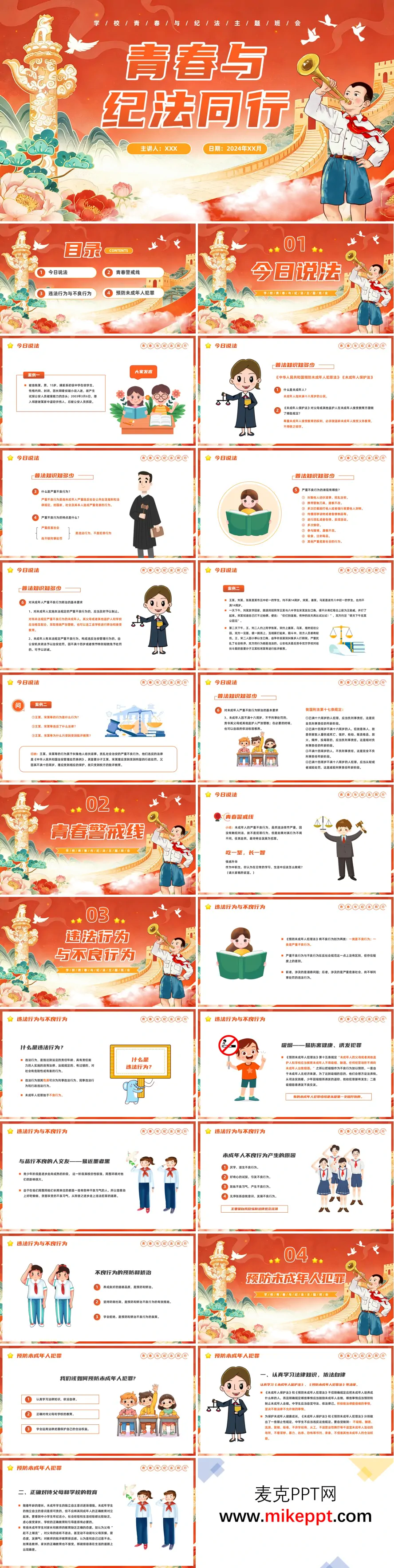 这是一套以“青春与纪法同行”为主题的校园班会课件,采用红色国风与卡通风格相结合的设计,旨在通过生动有趣的形式,引导青少年树立正确的法治观念,助力他们在青春阶段健康成长。课件分为四大板块,内容丰富且结构清晰。 第一部分为“今日说法”,通过真实案例引入话题,如未成年人盗窃、斗殴等常见违法行为。结合《预防未成年人犯罪法》和《未成年人保护法》,课件详细讲解了未成年人、不良行为等法律概念,深入分析案例中行为的违法性及其可能带来的严重后果,帮助学生从实际案例中理解法律的严肃性和重要性。 第二部分“青春警戒线”则聚焦于不良行为的危害,通过具体案例和生动讲解,警示学生不良行为可能带来的严重后果,引导他们反思自身行为边界,增强自我约束能力,避免因一时冲动或无知而陷入违法犯罪的泥沼。 第三部分深入解析“违法行为与不良行为”的定义及其区别,明确指出吸烟、交友不慎等不良行为的诱因,并结合实际案例,给出具体的预防方法,如培养良好品德、谨慎交友、主动学习法律知识等,帮助学生从思想和行为上筑牢防线。 第四部分“预防未成年人犯罪”是课件的核心内容,提出了一系列具体举措,包括学习法律知识、接受家庭和学校的教育引导、学会运用法律维护自身权益等。最后,课件以“学法懂法、守法护法”作为总结,进一步强化学生的纪法意识,鼓励他们在青春的道路上知法守法,健康成长。 整套课件以案例、知识、方法相结合的结构,紧密贴合学生的认知特点和实际需求,通过生动有趣的形式,将严肃的法律知识转化为青少年易于接受的内容,是一份极具教育意义和实用价值的校园班会课件,能够有效助力青春阶段的纪法教育。