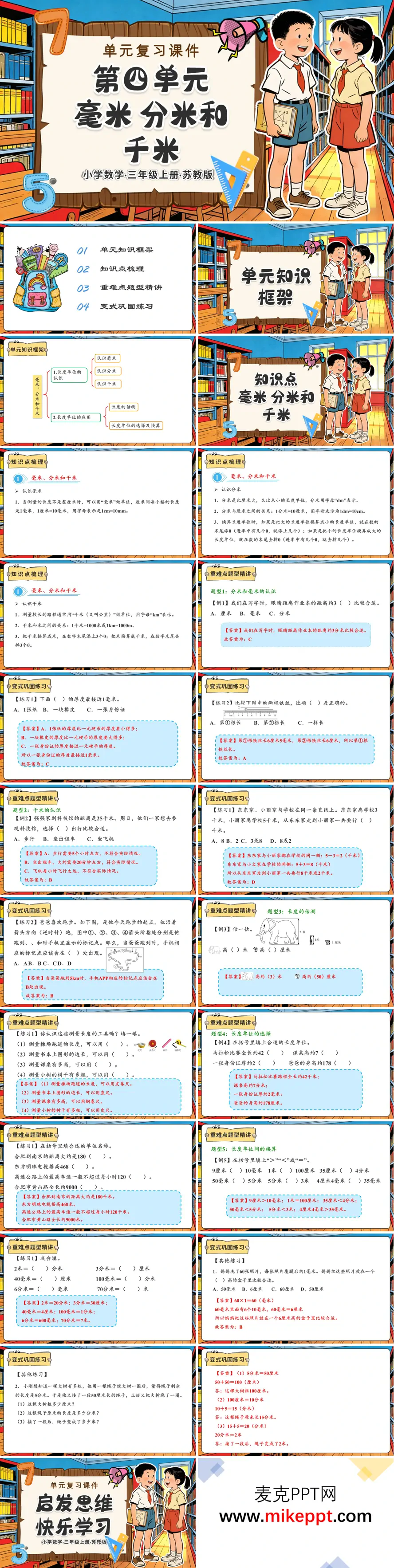 这份苏教版三年级上册第四单元复习课件紧扣“毫米、分米和千米”这一长度单位主题,以“框架—梳理—精讲—变式”四步推进,由点到面地帮学生把“小单位”与“大单位”串成一条清晰的长度链。开篇先用一张彩虹式知识梯呈现核心板块:认识单位→读写符号→单位换算→生活应用,梯级颜色随单位量级由小到大渐变,学生一眼看出“毫米在底、千米在天”。梳理环节用“手指宽1厘米=10毫米、课桌高1分米=10厘米、操场圈1千米=1000米”三幅实拍图,对应出现字母表示mm、cm、dm、m、km,让符号与实物结成对;换算口诀被编成“大化小乘上进,小化大除下退”,配动画箭头从千米滑到毫米,方向即算法,记忆负担瞬间减半。重难点精讲挑五大题型:①选单位——“去动物园坐公交还是步行?”让学生把3千米、300米、30毫米放进生活场景;②填空——“铅笔长15____”用实物对比矫正“厘米”误写“毫米”;③比较——“990米○1千米”用数轴拉一条1千米标线,直观看出小于关系;④换算——“2千米5米=____米”教先换再加;⑤测具选择——量课本、操场、教室分别用直尺、卷尺、步测,强化工具匹配。变式练习设三级闯关:A级基础口算;B级综合“学校到图书馆路线比较”先估后量;C级拓展“设计2千米健身路线图”,课后用运动APP验证,数据回传课堂生成条形图,体验“数学+体育”跨界。整套课件用实拍图、动画箭头、生活判断三管齐下,让长度单位不再抽象,估算、换算、测距一气呵成,帮孩子把“1毫米到1千米”真正装进脑袋,也装进脚下。