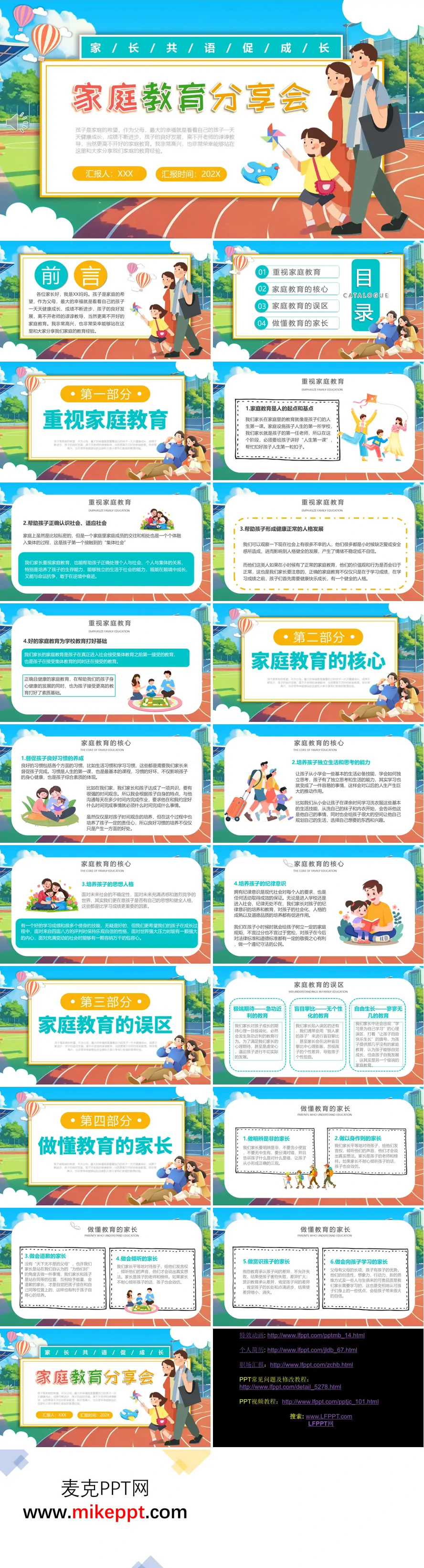 这是一套以“家长共语 促成长”为主题的家庭教育分享会课件,采用温馨的卡通风格设计,内容全面且实用,覆盖了家庭教育的全维度,旨在帮助家长更好地参与孩子的成长过程,提升家庭教育的质量。 课件分为四大板块,逻辑清晰,层次分明。第一部分着重强调家庭教育的重要价值,指出家庭教育是孩子“人生第一课”,在孩子成长过程中具有不可替代的作用。它不仅能帮助孩子适应社会、塑造健全的人格,还能为学校教育奠定坚实的基础。这一部分通过生动的案例和详实的分析,让家长深刻认识到家庭教育的重要性。 第二部分深入解析家庭教育的核心内容,包括好习惯的养成、独立生活与思考能力的培养、思想人格的塑造以及规则意识的建立。通过结合日常案例,课件清晰地展示了这些能力对孩子成长的关键作用,引导家长在日常生活中关注并培养孩子的这些核心素养。 第三部分则聚焦于家庭教育中常见的误区,如对孩子的极端期待、盲目攀比、过度放任等。课件通过具体事例,提醒家长避免这些错误的教育方式,帮助他们认识到这些误区可能对孩子成长带来的负面影响,从而引导家长树立正确的教育观念。 第四部分为家长提供了成为“懂教育的家长”的行动方向。课件建议家长明确是非标准、以身作则、学会道歉、懂得倾听、赏识孩子以及向孩子学习。这些具体的行动指南,旨在引导家长以科学、理性的方式参与孩子的成长,营造良好的家庭氛围,助力孩子全面发展。 整套课件以温馨的卡通风格呈现,形式生动,内容实用,从理念到方法全面覆盖家庭教育的各个方面,非常适合家长在交流分享场景中使用。它不仅能帮助家长提升自身的教育水平,还能促进家长之间的相互学习与交流,共同为孩子的成长创造更好的环境。