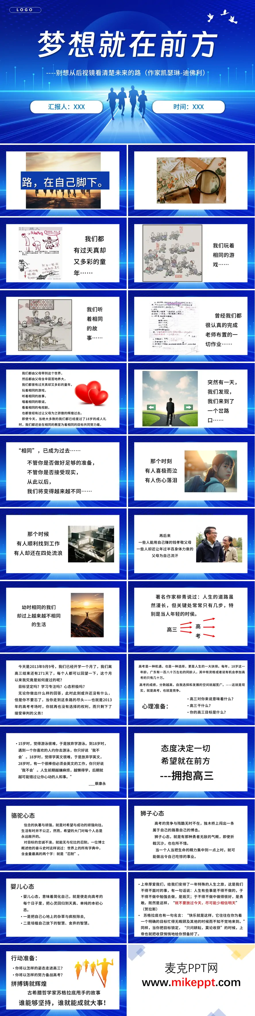 这是一套以“梦想就在前方”为主题的高三励志课件,旨在通过生动的案例和实用的指导,帮助高三学生在备考的关键时期调整认知、端正心态、掌握方法,从而全力以赴迎接高考的挑战。 课件开篇以“童年相似,成年各异”的成长轨迹为切入点,迅速引发学生的共鸣。通过对比童年与成年的不同,点明高三这一人生关键节点的重要性。结合高考竞争的激烈现状,课件引导学生反思自身的备考状态,激发他们对未来的思考与规划。 在核心部分,课件从心态、行动和方法三个维度展开详细阐述。首先,心态准备方面,课件提出了“骆驼心态(坚持)”“狮子心态(拼搏)”和“婴儿心态(纯粹)”三种心态模式,强调“态度决定一切”,鼓励学生以积极的心态面对高三备考的挑战。 其次,行动准备部分,课件通过苏格拉底甩手的故事,生动地说明了坚持的重要性。同时,结合实际操作,课件给出了学习要有计划性、主动求知、及时反思等具体要求,帮助学生将备考计划落到实处。 第三,方法指引方面,课件结合高分学生的成功经验,明确了“基础综合化、能力多元化”的备考方向。通过具体的策略和建议,课件帮助学生在复习过程中抓住重点,提升学习效率。 最后,课件以“高三六句话”(如争分夺秒、以苦为乐等)强化学生的斗志,并用“三个馒头”的比喻形象地说明了积累的重要性。在收尾部分,课件呼吁学生珍惜高三时光,全力以赴拼搏,为梦想而战。 整套课件以励志氛围为主,从认知唤醒到方法落地,层层递进,适配高三学生的备考动员场景。通过生动的案例、实用的建议和鼓舞人心的呼吁,课件能够有效激发高三学生的备考热情,帮助他们在高考的道路上坚定信念、勇往直前。