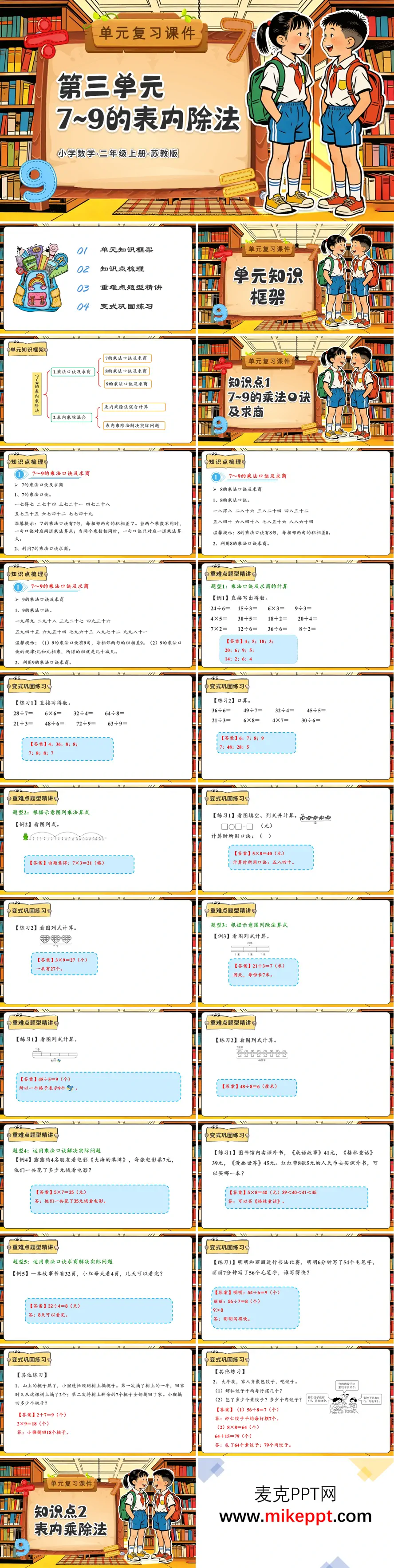 这份苏教版二年级上册第三单元复习课件聚焦“7~9的表内除法”,沿用“知识框架—梳理—精讲—练习”四步路径,将口诀记忆、混合运算与解决问题串成一条清晰的学习链。开篇先甩出双色思维导图:左侧“乘法口诀及求商”——7、8、9的口诀特点;右侧“表内乘除混合”——乘除互逆、混合运算、生活应用,两大模块用不同色块呈现,学生一眼抓住“先记口诀、再练互逆、最后解决混合题”的主线。梳理环节把9的口诀编成“几十减几”小魔术:屏幕出6×9,学生齐喊“60-6=54”,答案瞬间飞出,动画特效让口诀不再枯燥;8的口诀用“双四”节奏读,7的口诀配“星期歌”,声音、节奏、视觉三管齐下,记忆效果加倍。求商方法被归纳成“对口令倒着背”:看到63÷9,齐背“七九六十三”,商7自动跳入算式,孩子自然体会乘除互逆。重难点精讲挑6类题型层层升级:①口算——“火车接龙”随机出56÷8、72÷9等,答对车厢自动连接;②看图列式——“小猴摘桃”动画先出现8棵树共摘56个桃,学生写56÷8=7,再口答每棵树个数;③混合运算——“先乘后除”与“先除后乘”对比出现,用颜色区分运算顺序;④电影票——“每张8元,64元能买几张?”用拖拽钞票动画一张一张飞走,孩子眼见“总数÷单价=数量”;⑤看书计划——“每天看9页,81页几天看完?”用翻页特效一天一天减少,理解“总量÷每天量=天数”;⑥逆向思考——“已知商和除数求被除数”,用“倒着乘”验证,培养互逆思维。巩固练习设三级闯关:A级基础——口算卡片快闪,写答案抢答;B级综合——乘除混合脱式计算,强调顺序;C级拓展——“包饺子”情境:奶奶每次包9个,要包72个,几次能完成?再升级“如果每次多包3个,几次完成?”两步混合,训练思维灵活性。课后还配“口诀大富翁”游戏纸,学生掷骰子走格子,落到哪格背哪句口诀,背错停一轮,家长微信群上传视频,老师评选“口诀小达人”。整套课件用节奏口诀、动画情境、生活问题三连击,让7~9的除法不再只是背口诀,而成为摘桃、买票、包饺子的超级工具,帮助二年级娃把表内除法算得准、用得快、说得清。