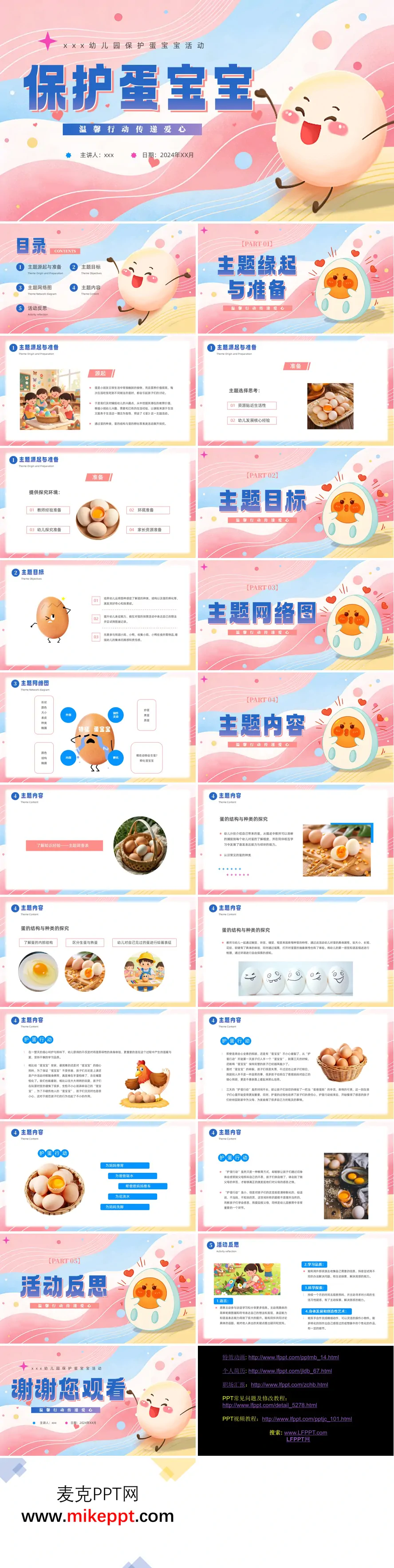 这套PPT文档以“保护蛋宝宝”为主题,详细记录了某幼儿园为小班幼儿设计并实施的一次富有教育意义的主题活动。活动内容主要围绕“蛋”展开,共分为五个部分。 首先,活动源于幼儿日常进餐时对蛋的浓厚兴趣,教师捕捉到这一契机,挖掘其教育价值,确立了活动主题。活动目标明确,旨在培养幼儿运用感官探索蛋的种类、结构与孵化过程,激发其好奇心和探索欲,同时提升其表征能力、责任感及感恩意识。 活动核心内容包括两大环节:一是对蛋的探究,幼儿通过观察、触摸、比较等方式认识不同蛋的特征和内部结构,并用绘画进行表征;二是为期三天的“护蛋行动”,幼儿需全天候小心翼翼地呵护自己的“蛋宝宝”。在此过程中,孩子们亲身体验了照顾者的不易,即使有蛋意外破碎,他们也从中深刻体会到责任与亲情。活动延伸至家庭,孩子们主动为父母做些力所能及的事情,学会了感恩。 最后,活动反思总结了幼儿在语言表达、学习品质、科学探索及动手能力等方面的显著成长。整个活动设计巧妙,将生活资源转化为生动的课程,有效促进了幼儿的全面发展。