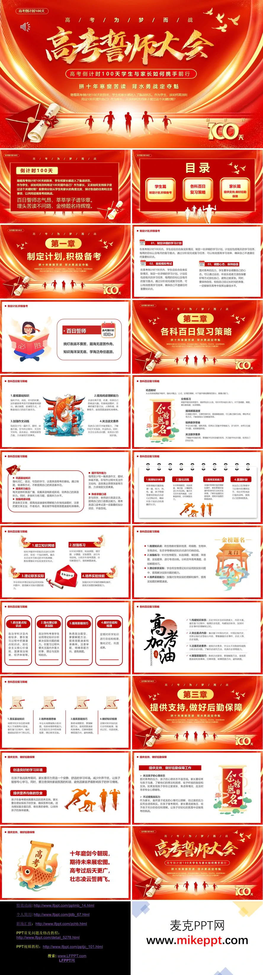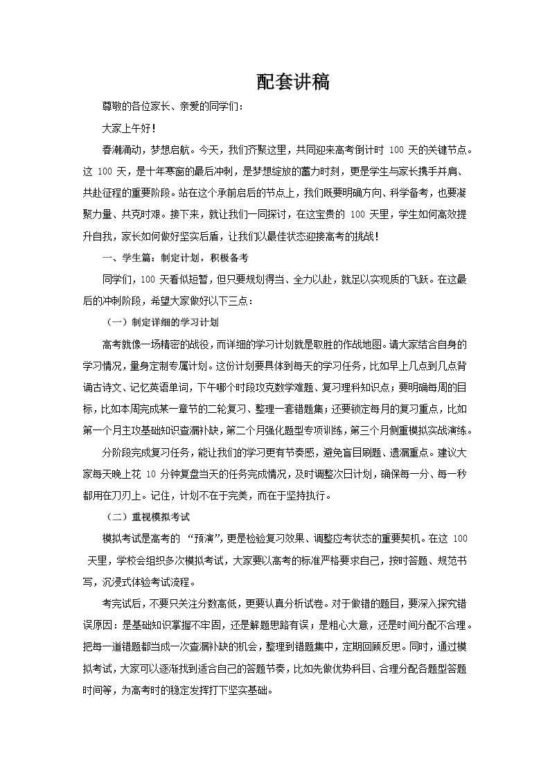 这是一套专为高考倒计时100天设计的誓师大会课件,以“学生、学科、家长”三大维度为核心,全方位指导考生和家长携手冲刺,助力考生在高考的最后阶段取得优异成绩。 第一部分“学生篇”聚焦于备考规划,为考生提供清晰的冲刺方向。课件建议考生制定科学的每日学习计划,合理分配各学科的复习时间,确保复习的系统性和高效性。同时,强调模拟考试的重要性,通过模拟实战,帮助考生熟悉考试流程,提升应试能力。此外,课件特别指出“稳心态、保自信”的关键性,鼓励考生以积极的心态迎接挑战,保持自信,克服备考过程中的焦虑和压力。 第二部分“各科百日复习策略”针对高考各学科的特点,提供了具体的复习方法。语文复习要注重基础知识的巩固和阅读能力的提升,通过大量阅读和练习,提高答题的准确性和速度;数学复习则要聚焦题型和运算能力,通过专项训练,攻克难题,提高解题效率;英语复习需强化听力和写作,通过模拟练习和真题训练,提升语言运用能力。对于理综(理化生),课件建议考生构建完整的知识网络,强化实验操作能力,确保理论与实践相结合;文综(政史地)则要聚焦重点知识,提升答题技巧,通过总结和归纳,提高答题的规范性和准确性。这些策略覆盖了各学科的核心备考方向,帮助考生在有限的时间内高效复习。 第三部分“家长篇”明确了家长在高考冲刺阶段的重要角色。家长需为考生创造安静、舒适的学习环境,保障营养均衡的饮食,为考生的身体健康提供坚实后盾。同时,家长要密切关注孩子的心态变化,避免过度施压,给予孩子充分的理解和支持。通过情绪和生活上的全方位支持,帮助考生保持最佳状态。 整套课件以红色励志风格呈现,从学生备考方法到家长配合要点,全方位覆盖高考百日冲刺的核心需求。它不仅为考生提供了清晰的复习方向,也为家长提供了科学的指导建议,适配誓师大会的动员场景,能够有效激发考生和家长的备考热情,助力考生在高考中取得优异成绩。