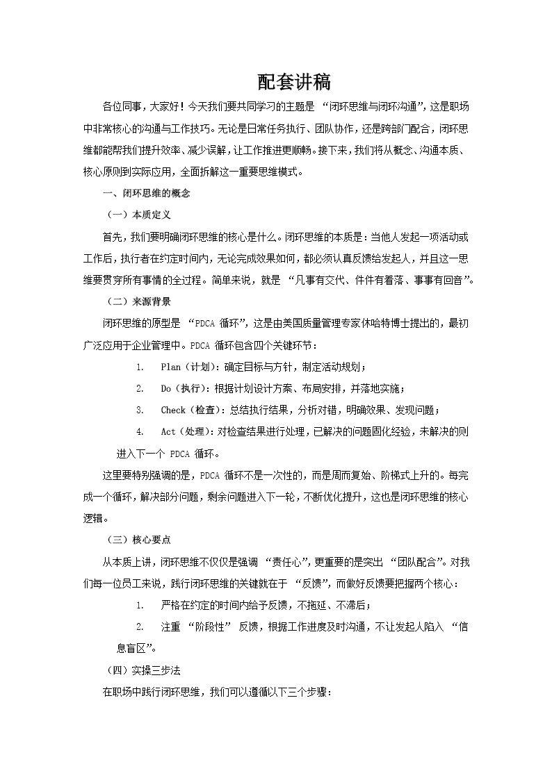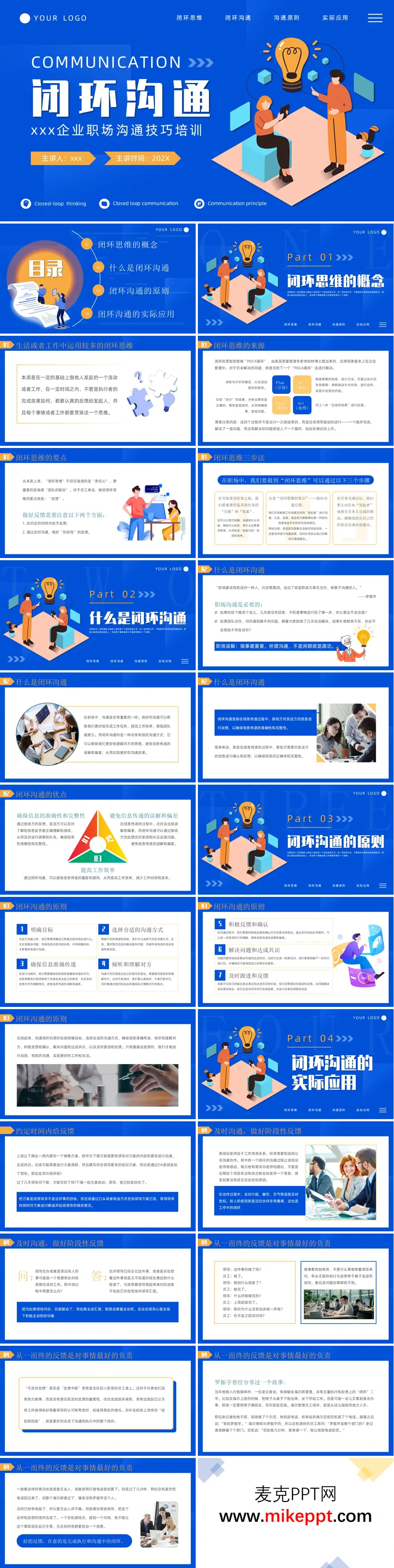 这套PPT以“闭环沟通”为核心主题,系统性地介绍了现代职场中高效沟通的理念与方法。内容分为四个主要部分:首先从“闭环思维”的概念入手,强调任何工作都要做到有始有终,及时反馈;接着明确“闭环沟通”的定义,即通过接收方的确认反馈来确保信息传递的准确性,避免误解;第三部分详细阐述了闭环沟通的七大原则,包括明确目标、倾听理解、积极反馈等;最后通过具体职场场景案例,说明如何在实际工作中运用闭环沟通,如约定时间内反馈、阶段性汇报等。整套PPT逻辑清晰,从理论到实践,旨在帮助企业员工培养责任意识与团队协作能力,提升沟通效率与工作执行力。