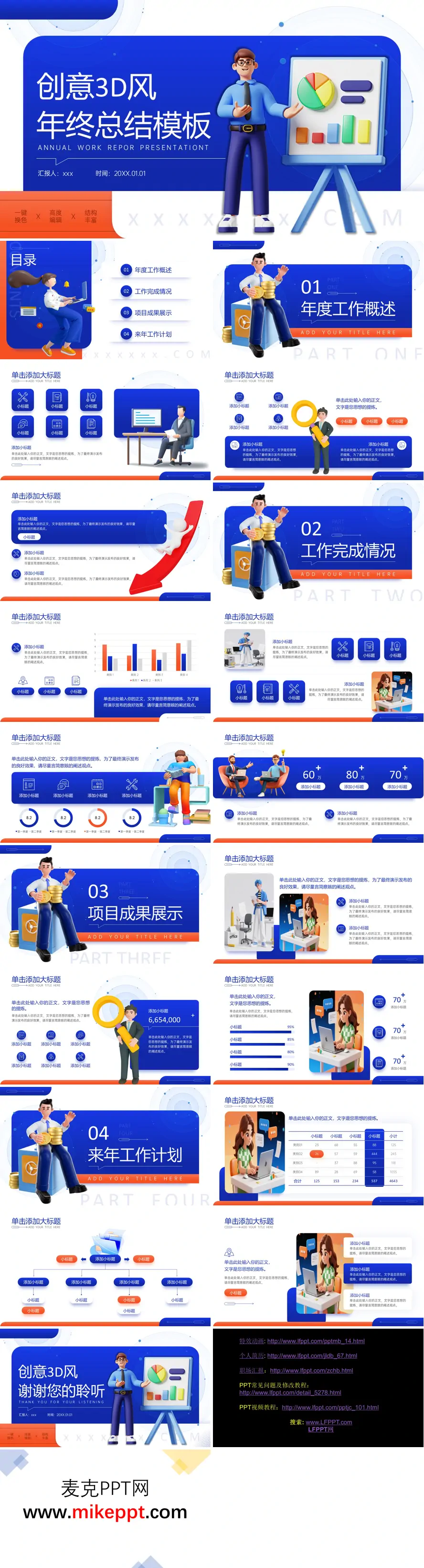 这份创意3D风年终总结PPT模板以立体几何元素和现代设计风格为特色,整体结构清晰,视觉层次分明。模板封面采用"ANNUAL WORK REPORT PRESENTATION"主标题搭配3D渲染效果,右下角设有汇报人及时间信息,并标注"一键高度结构换色编辑丰富"的智能化设计功能。 目录页采用四分区布局(年度工作概述/工作完成情况/项目成果展示/来年工作计划),每个章节均配备3D造型的数字序号标识。内容页设计呈现模块化特点,通过"单击添加大标题"的交互提示框和色块分隔的版式,形成标准的"大标题-小标题-正文"三级文本体系。在项目成果展示部分,模板创新性地融入了数据可视化组件,包含环形百分比进度条和柱状统计图表等专业元素,同时设置了多组突出关键数据的数字浮动标签(如"60万""+80万"等量化指标)。表格页采用渐变色表头与留白排版相结合的方式,既确保数据呈现的严谨性,又保持了视觉的轻盈感。 封底页与封面形成呼应设计,采用中英文双语的"谢谢聆听"致谢语,整体贯穿的立体几何元素与商务蓝主色调,共同构建出专业而不失创意的年度总结视觉系统。该模板通过智能色彩管理系统和模块化布局,有效提升了内容编排的灵活性与视觉表现力。