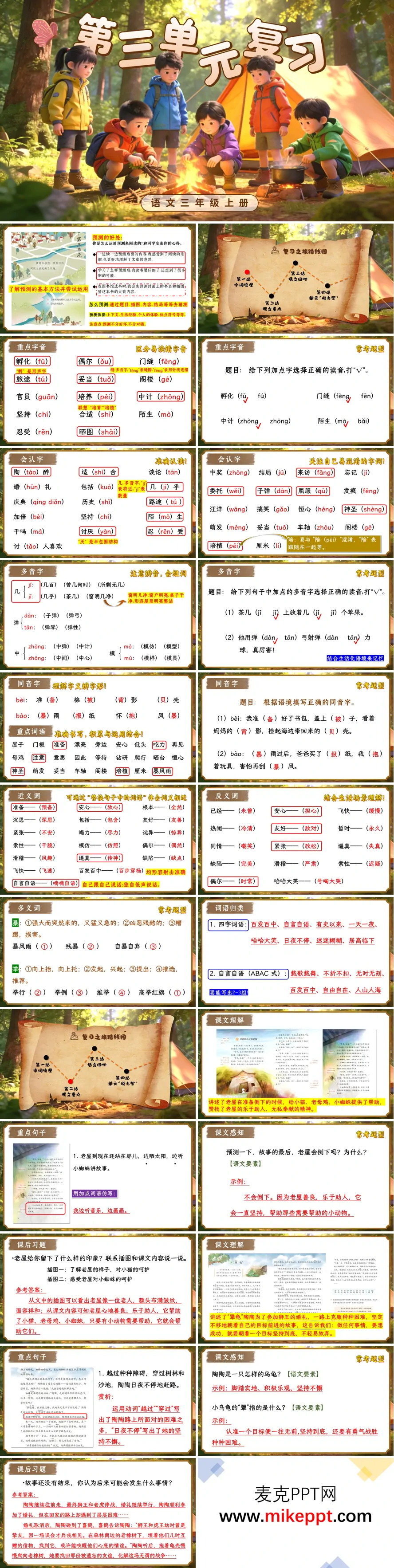 这份三年级上册第三单元复习PPT以“猜测与推想”作航标,用一条“复习之旅路线图”带领学生驶入预测的奇妙海域:先拾字词贝壳,再登课文灯塔,接着操练园地罗盘,随后展开口语风帆,最后执笔续写新航线,五步连环,让阅读期待与创编热情同频高涨。字词梳理码头把易错音、多音字、同音字、近反义词装进“预测百宝箱”,“暴”与“爆”用动画演示字源,“准备”与“预料”在跷跷板上对比,学生抢答归类,基础在欢笑中夯实。课文灯塔依次照亮《总也倒不了的老屋》《犟龟》《小狗学叫》:阅读《老屋》时,教师先遮结尾,让学生根据“小猫、老母鸡、蜘蛛”三次请求猜结局,再揭示“总也倒不了”的温情,渗透“线索+生活经验”预测法;学《犟龟》用时间轴定格乌龟的“固执前行”,学生边读边在便利贴写“我猜它遇到谁”,贴于黑板形成“预测轨迹”,验证后体验“猜中”的惊喜;读《小狗学叫》则放出多版本叫声,让学生猜“这次遇见谁”,再对照文本,感受“预测可修正”的阅读乐趣。园地罗盘提供三大工具:预测方法交流表——“我看到……我猜……因为……”;字典识字角——用部首查字法解锁“暴风雨”等生词;词句段运用——把“准备、暴风雨、墙壁”编入预测句式,口头接龙。口语交际以“名字里的故事”为主题,学生先采访父母记录名字含义,再上台“开盲盒”抽同学名字猜寓意,答中奖励“预测星”。习作港口要求续写故事:提供“老屋前出现一只受伤的小雁”开头,先集体填“预测鱼骨图”——可能遇到谁、发生什么、结果怎样,再给出范文《小雁得救》,结构清晰,情感温暖,学生仿写后投进“故事漂流瓶”,下节课互评盖章。整份教案把字词、阅读、口语、写作融进一条“猜—读—验—说—写”的预测链,让三年级孩子明白:阅读不是被动接收,而是一场与文本的聪明对话,续写则是把对话继续延伸,复习课也能充满悬念与创造。
