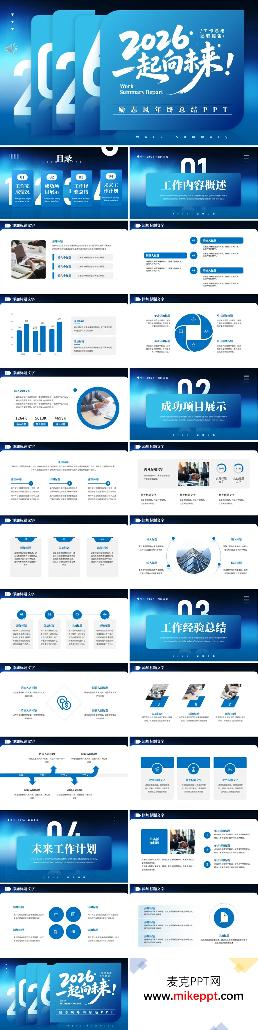 这套 PPT 是一套主题为“2026 一起向未来”的励志风年终总结模板,以蓝白渐变的现代感风格为主,兼具简洁与大气,非常适合工作总结、述职等职场场景。整套模板围绕四大核心部分展开,结构清晰、内容丰富,能够满足不同职场人士的汇报需求。 第一部分为“工作内容概述”,采用图文分点、流程图、柱状图等多种版式,系统梳理年度工作的整体框架与核心脉络。这种设计帮助汇报者快速呈现工作全貌,让听众能够在短时间内把握工作的重点与方向。图文结合的形式不仅使信息传达更加直观,还提升了汇报的专业性。 第二部分是“成功项目展示”,配备数据卡片、进度图、模块清单等布局,能够直观地呈现项目成果和业绩数据。通过这些可视化元素,项目亮点得以突出,成功经验得以分享,让听众清晰地看到团队在过去一年中的努力与收获。这一部分的设计旨在增强汇报的说服力,同时激发团队的成就感。 第三部分聚焦“工作经验总结”,支持通过时间轴、分点拆解、对比图等形式复盘工作方法和得失教训。这种结构化的总结方式让经验提炼更有条理,帮助汇报者清晰地梳理工作中的关键节点,总结成功经验,反思不足之处。这一部分不仅为个人和团队的成长提供了宝贵的参考,也为未来的工作改进奠定了基础。 第四部分为“未来工作计划”,结合分模块清单、流程图等版式,帮助汇报者拆解下阶段目标与行动步骤,清晰铺排后续工作方向。通过明确的目标分解和清晰的行动规划,这一部分为团队在新的一年中指明了方向,同时也传递出“一起向未来”的奋进氛围,激励团队成员在新的一年中继续努力,勇往直前。 整套模板以蓝白渐变为主色调,营造出清新、现代的视觉效果,既保留了汇报的正式感,又通过“一起向未来”的主题传递出积极向上的奋进氛围。版式灵活多变,能够满足不同场景下的汇报需求,无论是企业年终总结、团队述职还是个人工作汇报,都能轻松适配。这是一套兼具实用性和美感的职场总结工具,能够帮助职场人士高效完成年终汇报,展望未来目标。