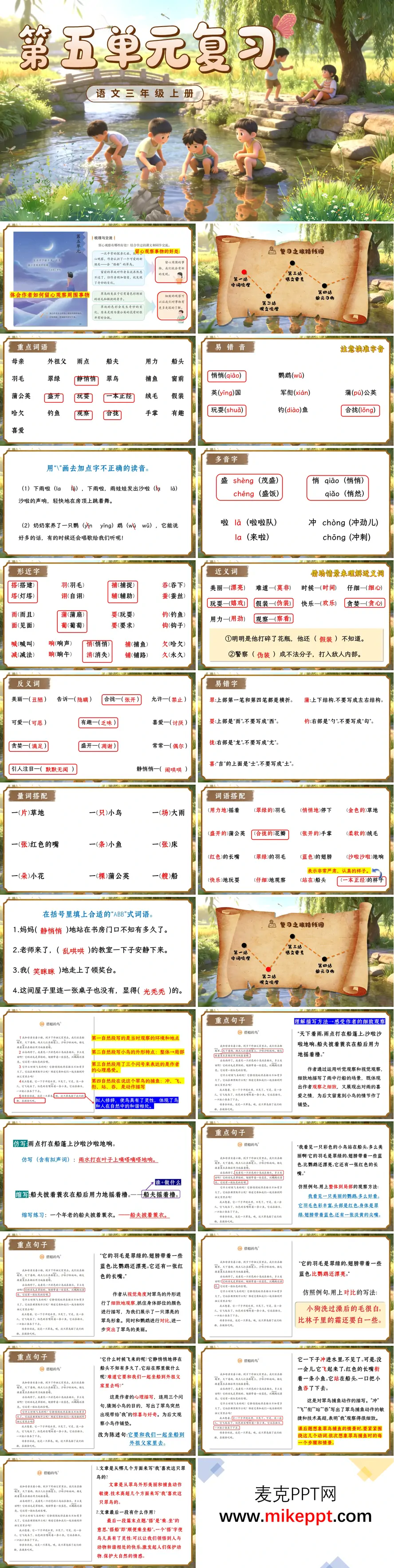 这份三年级上册第五单元复习PPT以“留心观察周围事物”为总纲,用一条“复习之旅路线图”带领学生从字词码头出发,途经课文观察站、梳理交流谷,最终抵达习作展示台,完成一次“发现—提炼—表达”的完整观察训练。字词梳理码头先把“翠鸟、蒲公英、合拢”等易错词装进“观察背包”,用“拼音小火车”拖拽正音,用“字形放大镜”对比“拢与笼”“蒲与铺”,学生边玩边记,基础打得轻松扎实。课文观察站聚焦《搭船的鸟》《金色的草地》:读《搭船的鸟》时,教师播放翠鸟俯冲捕鱼慢镜头,学生圈画“红色长嘴、翠绿羽毛”等颜色词,提炼“看颜色”这一观察角度;再看“像箭一样飞过去”,用箭头动画体会比喻的生动,总结出“看动作”也能写出精彩。学《金色的草地》则用“时间轴”GIF:早晨—中午—傍晚,草地颜色随阳光变化,学生在表格里记录“绿色—金色—绿色”,发现“关注变化”让观察更有趣;教师再让学生闭眼听“风吹蒲公英”的沙沙声,引出“调动耳朵”的观察法,多感官体验让文字更立体。梳理交流谷开展“观察分享会”:学生拿出课前完成的“校园一角”观察卡,有的说“三角梅的花瓣像小扇子”,有的写“蚂蚁排队搬饼干,像一条黑线”,教师即时贴“角度星”“变化星”,鼓励学生比一比谁的发现最独特。习作展示台以“我们眼中的缤纷世界”为题,先出示范文《阳台上的牵牛花》:按“远看—近看—触摸—联想”顺序写,再提供“观察脚手架”——时间、颜色、形状、声音、气味五栏,学生自选对象,课堂上完成“观察提纲”,课后继续补充成文,优秀作品配上照片张贴在“缤纷世界”展板,邀请家长扫码点评。整条路线图将观察方法、语言积累、口语表达、习作训练融为一体,让三年级学生明白:只要用心看、仔细听、持续跟踪,再普通的事物也能开出绚烂的文字之花,复习课由此变成了一场发现世界、记录美好的奇妙旅行。