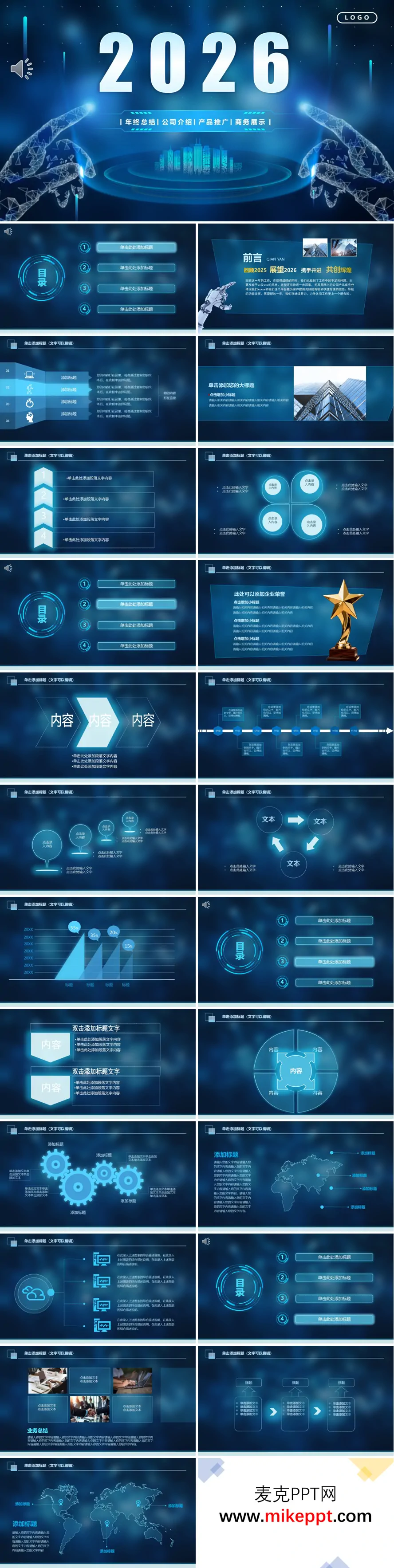 这套 PPT 是一套专为 2026 年设计的科技风通用展示模板,凭借其深蓝色调搭配未来感界面的独特风格,能够轻松适配年终总结、公司介绍、产品推广等多种职场场景,为各类汇报与展示提供强大支持。 模板整体结构清晰且灵活多元,包含前言、核心板块和成果展示等主要部分。前言部分聚焦于回顾 2025 年的关键成就与重要时刻,同时展望 2026 年的发展目标与愿景,为整个汇报奠定基调。核心板块则完全支持自定义主题,用户可根据具体需求灵活调整内容,无论是业务流程介绍、市场分析还是团队建设,都能精准呈现。成果展示部分则通过荣誉陈列、数据模块等设计,直观呈现团队或公司在过去一年中的卓越表现,让观众迅速捕捉到关键亮点。 在版式设计上,模板配备了丰富的选项,如分点清单、数据图表(包括柱状图、饼图)、流程示意图、图文组合,甚至还有世界地图可视化等模块,能够满足从文字说明到复杂数据呈现的多样化信息展示需求。这些版式不仅功能性强,还通过统一的科技风设计保持了整体的视觉一致性。 此外,模板巧妙融入了科技元素,如全息界面、齿轮、数据节点等,这些细节不仅增强了视觉吸引力,更让整个 PPT 在保留商务汇报专业性的同时,展现出强烈的未来感和科技感。用户可以根据具体需求填充具体内容,无论是企业内部汇报还是对外展示,都能轻松驾驭。 整套模板以深蓝色为主色调,搭配未来感界面,营造出专业且富有创新力的视觉效果。无论是年终总结、公司介绍还是产品推广,都能通过这套模板清晰、高效地传达信息,是多场景下的实用展示工具,能够帮助用户在各类汇报中脱颖而出,传递出“科技赋能未来”的核心理念。
