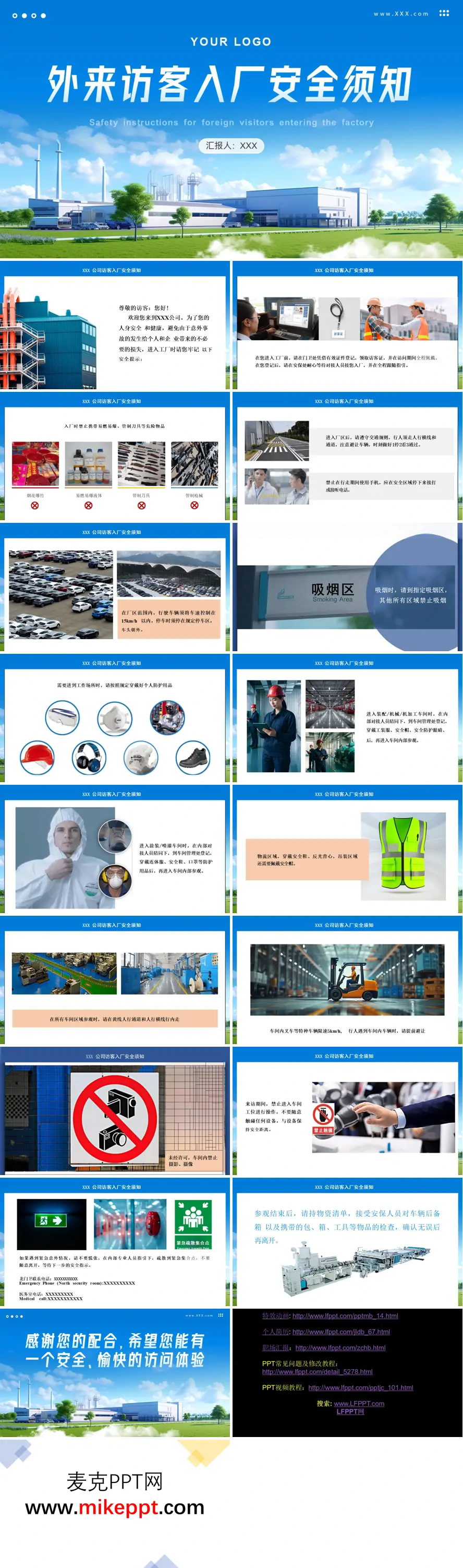 这套企业《入厂安全须知》PPT以蓝色为主调,搭配工厂实景背景,风格正式清晰,系统规范访客全流程安全管理。开篇阐明保障访客与企业安全的宗旨,随后详述入厂登记、领取访客证及专人陪同等流程。 核心内容涵盖多项安全禁忌:严禁携带易燃易爆品与管制器具,厂区内须走人行横道、禁用手机,车辆限速15km/h并定点停放,吸烟仅限专用区域。针对不同车间明确防护标准:装配/机加工区域需穿戴工装与安全帽,涂装/喷漆车间另加连体服和口罩,特殊区域还需反光背心。 PPT强调参观须走指定通道,主动避让叉车等设备,严禁操作生产设施及拍照摄像。文末补充应急疏散集合点与离厂物资查验要求,以感谢配合收尾。整体通过图文结合,将复杂安全规则拆解为具体可执行的指引,是企业防范风险、强化访客管理的实用工具。