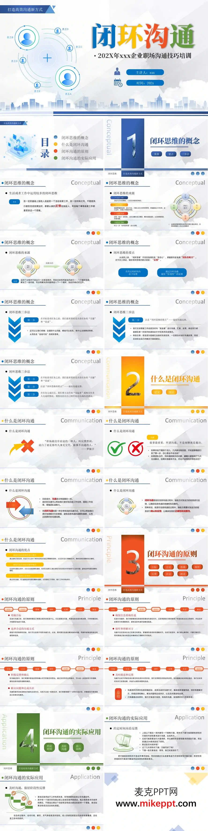 这套PPT以"打造高效沟通新方式"为主题,通过图文结合的方式系统性地介绍了闭环沟通的核心概念与实际应用。文档开头以员工形象插图营造职场氛围,为后续内容奠定实用基调。 在概念部分,PPT从PDCA循环(计划-执行-检查-处理)入手阐释闭环思维的起源,强调其"周而复始、阶梯式上升"的特质。特别指出闭环思维的本质不仅在于责任心,更注重团队配合中的及时反馈。通过三步法示意图,清晰展示从明确任务需求到阶段性反馈,再到最终总结的完整闭环流程。 沟通应用环节,文档用对比案例生动展现闭环沟通的实践价值。其中一个典型案例是,员工发送方案后未主动告知领导,导致信息脱节;相反,培训顾问即使项目未成交也会主动反馈结果。这些实例印证了罗振宇提出的"反馈黑洞"警示,强调"收到即回复"的职场基本素养。 最后通过海尔总机查无此人仍坚持回电的经典故事,凸显闭环沟通"从一而终"的核心理念。整套PPT将理论框架与场景化案例巧妙结合,既阐述了七大沟通原则(目标、方式、准确、倾听、反馈、共识、跟进),又通过"约定时间-及时沟通-由一而终"三个维度给出了具体实践指引,形成完整的知识闭环体系。