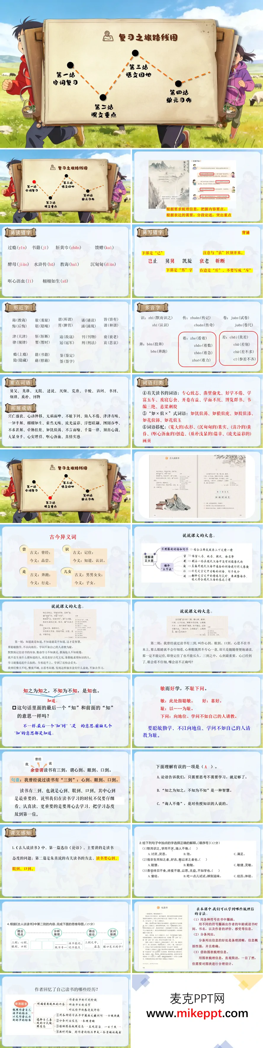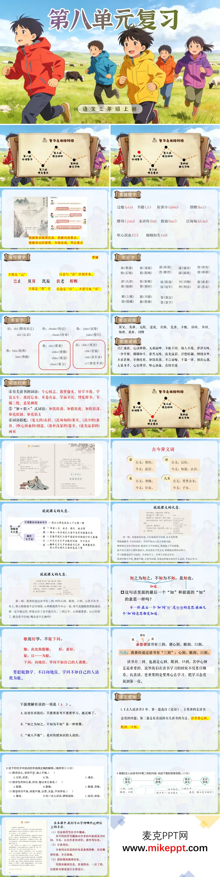 这份三年级上册语文第八单元复习PPT以“读书”为圆心,用“字词—课文—方法—写作”四环层层递进,为学生打造了一场“与书为友”的复习盛宴。开篇先亮“字词书架”:易错字“耻、诲、馈”用描红动画一笔一划修正;多音字“传、卷、好”配“读音小火车”情境选择;古今义对比把“下问”与“请教”并列,用对话框演示词义演变,学生秒懂“敏而好学,不耻下问”的谦逊底色;再设“读书词语专区”,把“博览群书、津津有味、如痴如醉”做成可翻动的书卡,边读边积累,语感悄然生长。课文解读站依次翻开三本书:《古人谈读书》用“孔子语录书签”飞入,学生摘抄“知之为知之,不知为不知”,教师引导做批注——圈“知”、点“不知”,再用便利贴写“我也要实事求是”,让千年训诫落地;《忆读书》以时间轴呈现冰心读书旅程:七岁时读《三国演义》“哭了一场”,十岁迷《水浒传》,成年后品《红楼梦》,学生在轴上贴“情感标签”,归纳“好书=引起共鸣+启发思考”;《我的“长生果”》把“书是长生果”做成动态果实:阅读浇灌→写作开花→成长结果,学生用“书是____”仿写比喻,答案弹幕飞出“书是望远镜、书是翅膀”,创意不断。方法训练站推出“批注三板斧”:圈关键词、画感情线、写疑问句,学生现场在电子课文做批注,系统即时点赞“金批注”。写作输出站以“好书推荐”收束:先出示范文《我心中的<昆虫记>》,按“开篇点题—内容简介—精彩片段—阅读收获”四段写,再提供“写作导航图”——书名、作者、最打动我的情节、我的收获,学生当堂完成推荐卡,课后配上手绘封面张贴在“班级书香墙”,扫码即可听作者朗读。整套PPT用书架动画、时间轴、果实生长三连环,让读书不再停留在口号,而成为圈点批注、比喻仿写、好书分享的可视化行动,助力三年级学生把“爱读书、读好书、会读书”真正写进自己的学习与生活。