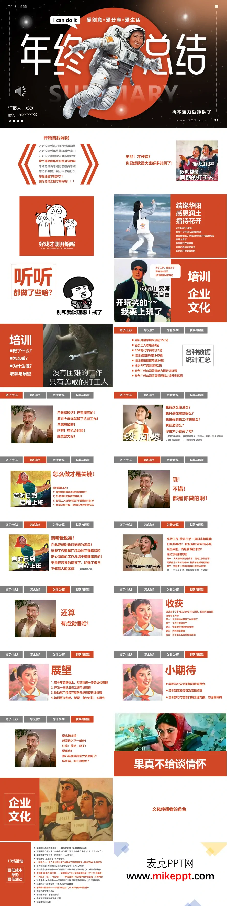 这套个人年终总结PPT以"爱创意・爱分享・爱生活"为主题,采用网络热梗、趣味插画与复古海报风格,打破传统总结的严肃感。核心围绕"培训工作"展开,开篇幽默自嘲年终总结的"难",简述入职华阳背景后,通过数据呈现实绩:全年组织150场常规培训、20场新员工入职培训等,并细化外训+内训并行、新员工手册随训等执行方法,同时以风趣话术感谢领导指导。 PPT阐述"高效工作+快乐生活"理念,总结年度收获如培训流程优化、项目经验积累,并提出来年展望:优化培训流程、开发基层课程,另补充参与19场企业文化活动的成果。最后以"再努力就掉队了"的俏皮口号收尾。整套PPT将工作成果与轻松表达结合,既清晰呈现业绩,又展现个人鲜活风格,是兼具实用性与趣味性的职场总结材料。