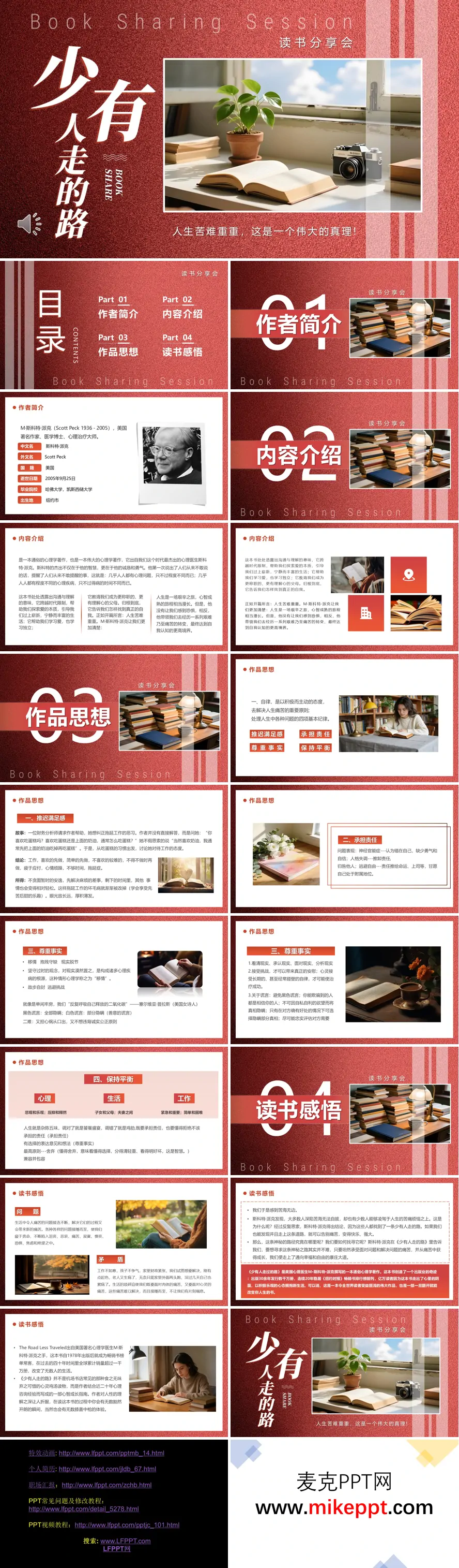 这份PPT以《少有人走的路》为主题,围绕“人生苦难重重”这一核心观点展开,内容结构清晰,分为作者简介、内容介绍、作品思想和读书感悟四个部分。开篇通过醒目的图片与文字点明主旨,强调人生本质是一场艰辛之旅,但书中提供了走向心智成熟的可行路径。 作者M·斯科特·派克是美国著名心理治疗师,毕业于哈佛大学,其作品以诚恳和勇气著称,引导读者直面心理问题。书中指出,几乎人人都有不同程度的心理困扰,而真正的成长源于积极面对痛苦。内容部分突出该书的价值:它跨越时代,教人学习爱、独立与自我认知,帮助读者过上宁静而丰富的生活。 作品思想是PPT的重点,系统阐述了解决人生问题的四项纪律:推迟满足感、承担责任、尊重事实和保持平衡。例如,通过“先吃奶油还是蛋糕”的案例,生动说明推迟满足感对克服拖延的意义;在“尊重事实”一节,强调避免谎言、直面现实的重要性。最后,读书感悟部分以生活实例反映现实矛盾,指出承受痛苦并成长,正是“少有人走的路”的真谛——这条路虽艰难,却能引领人走向自由与幸福。 整份PPT逻辑层层递进,既有理论深度,又贴近生活,启发读者从痛苦中提炼智慧,实践真正的自我超越。