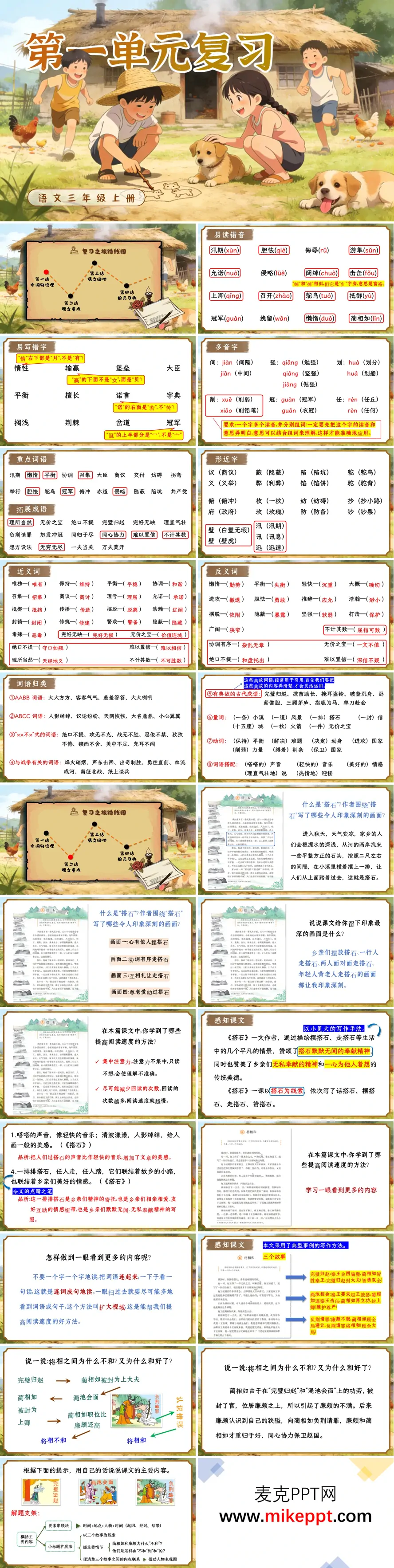 这份三年级上册语文第一单元复习PPT以“阅读速度训练”为主线,将《搭石》《将相和》《什么比猎豹的速度更快》《冀中的地道战》四篇课文串成一条“速读—理解—感悟”的能力链。先过字词关:用“动车接龙”闪现已混易错音“谴qiǎn、渑miǎn、豹bào”,形近字“协—胁、冠—寇”配红蓝对比动画;再把“协调有序、怒发冲冠、俯冲”等词语按描写对象自动归入“人物—动作—速度”三类篮,学生拖拽完成即可听见“叮咚”提示,基础积累在动手中完成。课文解析采用“三镜头”法:1.画面镜头——《搭石》播放乡亲们摆石、让石慢动作,学生圈画“紧走搭石慢过桥”等新鲜句,体会“互助”温度;2.故事镜头——《将相和》用时间轴呈现“完璧归赵→渑池会面→负荆请罪”,每节点弹出关键词,引导学生用“因果句”复述,感知蔺相如“顾全大局”与廉颇“知错能改”;3.数据镜头——《什么比猎豹的速度更快》将“110km/h、320km/h、光速”做成动态条形图,随朗读逐格伸长,学生一眼抓住“作比较、列数字”的说明效应;接着播放《冀中的地道战》VR航拍,地道剖面图配合“洞、口、气眼”字样闪现,让学生感受人民智慧。阅读策略站专设“速读训练营”:教师示范“连词成句读”,用高亮把“鸵鸟奔跑速度为72千米每小时”整句标出,计时器15秒滚动,学生跟读后再完成“谁比谁快”信息卡,检验捕捉关键词效果;随后进行“句式变形记”——把“光的速度是流星体的6倍”改为反问句、感叹句,锻炼语言灵活性。最后设“复述接力赛”:四人一组抽取课文思维导图,用“首先—接着—最后”口头复述,同伴计时并评价是否简洁完整,优胜组获得“速读小冠军”徽章。整套PPT用闪卡、时间轴、动态图、计时器四连环,让“提高阅读速度”不再是一句口号,而成为看得见的技巧、说得清的步骤、写得到的高分,助力学生在单元复习中既提速又提质,把阅读效率与理解深度同时推上新台阶。