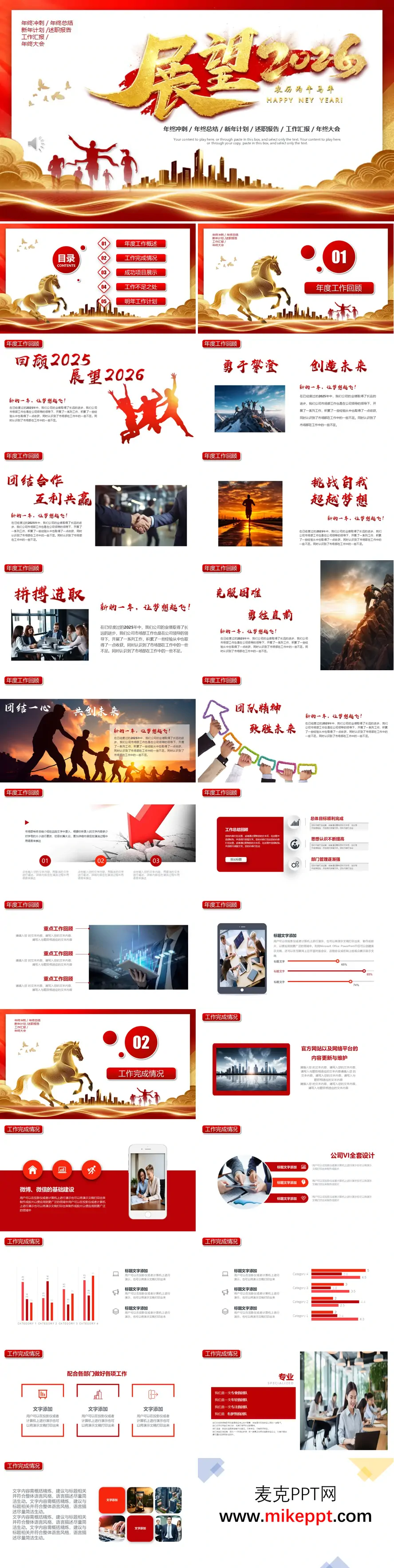 这套PPT以“年终冲刺/年终总结/新年计划/述职报告/工作汇报/年终大会”为主题,整体采用专业商务风格,结构清晰,视觉元素丰富,适用于企业年度总结与规划场景。 文档开头以农历丙午马年和新年祝福营造节日氛围,随后通过目录明确划分为五大模块:年度工作概述、工作完成情况、成功项目展示、工作不足之处及明年工作计划,逻辑层次分明。在年度工作回顾部分,PPT运用了多组励志关键词如“勇于攀登”“团结合作互利共赢”“拼搏进取”等,配合简洁的图标和布局,强调团队精神与年度成就,同时指出市场部工作的进步与不足,为后续内容铺垫。 工作完成情况模块通过数据图表、项目列表和团队介绍等形式,具体展示了官方网站维护、社交媒体建设、VI设计等成果,突出专业、年轻、专注的团队特质,并引用创收数据(如去年73,856元、今年96,169元)增强说服力。成功项目展示部分注重案例分析,通过分点描述和数据分析模板,引导观众关注关键成果。 不足之处模块以问题导向为主,列举管理、协作等方面的短板,并配套改进措施,体现反思深度。最后,明年工作计划模块以百分比进度条、目标分解图等形式,明确新年的整体思路与具体任务,结尾以“放眼世界展望未来”呼应开头,形成闭环。 整体来看,这套PPT内容覆盖全面,设计上注重图文结合,强调数据支撑与可操作性,既能满足述职汇报的严谨性,又通过视觉元素提升展示效果。