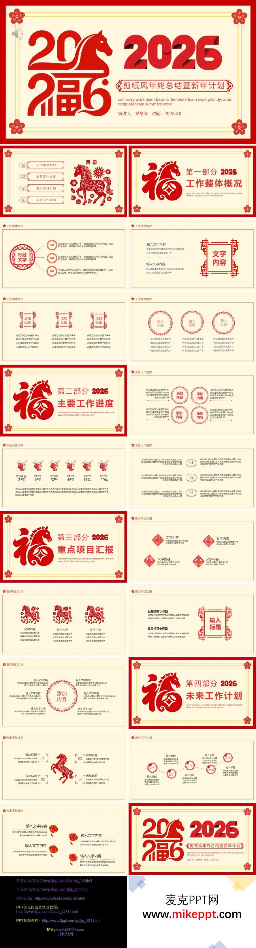 这套融合传统中式美学的年终总结PPT模板,专为2026丙午马年匠心打造,整体以红色为基底色调,巧妙融入剪纸艺术、梅花纹样与祥云图案等经典中式符号,并搭配生肖马视觉元素,营造出既喜庆祥和又底蕴深厚的独特氛围,广泛适用于各类企事业单位的年度总结及工作汇报场景。 在内容架构上,模板精心设计了四大递进式模块:"年度工作概述"作为开篇总纲,便于梳理全年战略方向与核心思路;"工作完成情况"配备分点陈列与数据图表版式,可直观展示各项任务的推进轨迹与量化成效;"工作成果及不足"采用对比分析布局,既能高光呈现业绩亮点,也能客观解剖短板弱项;而"新年工作计划"则提供多维规划框架,助力清晰设定来年目标与实施路径。 设计层面更显巧思,传统元素贯穿全篇,强化了岁末收官与新年开局的仪式感;各板块均预留"请在此输入标题/内容"的灵活占位符,实现信息快速替换;同时搭配风格协调的图标组件与数据可视化框架,既确保视觉统一性,又大幅提升内容填充效率。无论是部门集体述职还是个人岗位总结,此模板皆能借中式美学传递专业热忱,高效赋能从复盘到规划的全流程汇报需求。