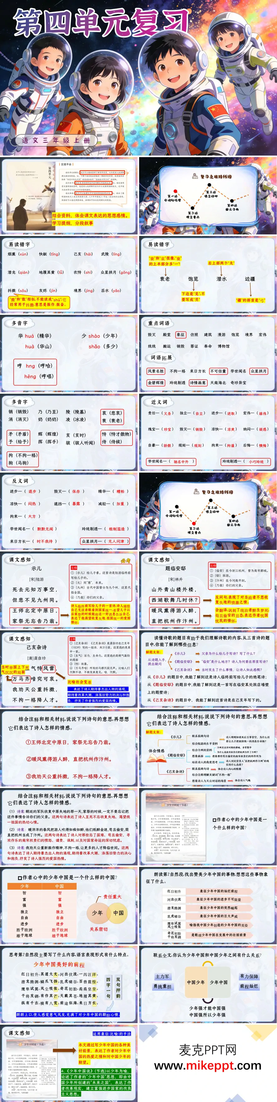 这份三年级上册语文第四单元复习PPT以爱国情为主线,用“字词—诗文—资料—情感”四环相扣的方式,将古典诗歌与现代散文熔于一炉,帮助学生夯实基础、升华情怀。开篇先搭“字词烽火台”:用“读音号角”纠正“祭jì、邸dǐ、亥hài、剔tī”等易错音;用“字形盾牌”区分“祭—察、邸—抵、澜—阑”等形近字;再把“悲愤、腐朽、金碧辉煌、不拘一格”等关键词送入“爱国词库”,学生拖拽归类,近反义词用“温度条”可视化呈现,词义在对比中清晰。诗文解读站分“古韵”“新声”两线:古诗线用“时空卷轴”依次展开《示儿》《题临安邸》《己亥杂诗》——卷轴一停,学生齐诵“王师北定中原日”,教师点亮“爱国遗愿”烽火;卷轴二现“山外青山楼外楼”,用动画叠加“醉生梦死”的南宋贵族,学生贴上“讽刺”标签;卷轴三落“我劝天公重抖擞”,用“人才星光图”点亮龚自珍的期盼,三首诗用“遗愿—讽刺—呼唤”连成爱国脉搏。新声线用“少年中国号”列车驶进《少年中国说》:排比句“少年智则国智……”被做成逐节上升的能量柱,学生齐读时能量条同步变色,直观感受“少年与国同命运”的磅礴气势;终点停靠《圆明园》:先用3D复原图展示“万园之园”的辉煌,再切换断壁残垣实景,弹幕飞出“惋惜、愤怒”关键词,学生用“对比圈”标注昔日与今日,情感在视觉冲击中升腾。方法站总结“结合资料体会情感”三步:搜背景—列画面—悟情感,学生现场用平板查“圆明园被掠文物”,将资料贴进“情感温度计”,温度从“惋惜”升至“愤怒”,体验“资料让情感更深”的逻辑。练习拓展设“爱国诗句接力”——把“家祭无忘告乃翁”改为反问句、感叹句;“少年中国说”排比仿写——“少年勤则国勤……”;课文主旨辨析——用“情感天平”衡量每篇文本的“爱—恨—盼”,并写一段“少年宣言”发布在班级云墙。整套PPT用卷轴、能量柱、复原图、温度条四连环,让爱国主题不再空洞,而成为可诵读、可对比、可查证、可表达的真切体验,帮助学生在掌握知识的同时,把“少年强则国强”的信念写进自己的声音和文字。
