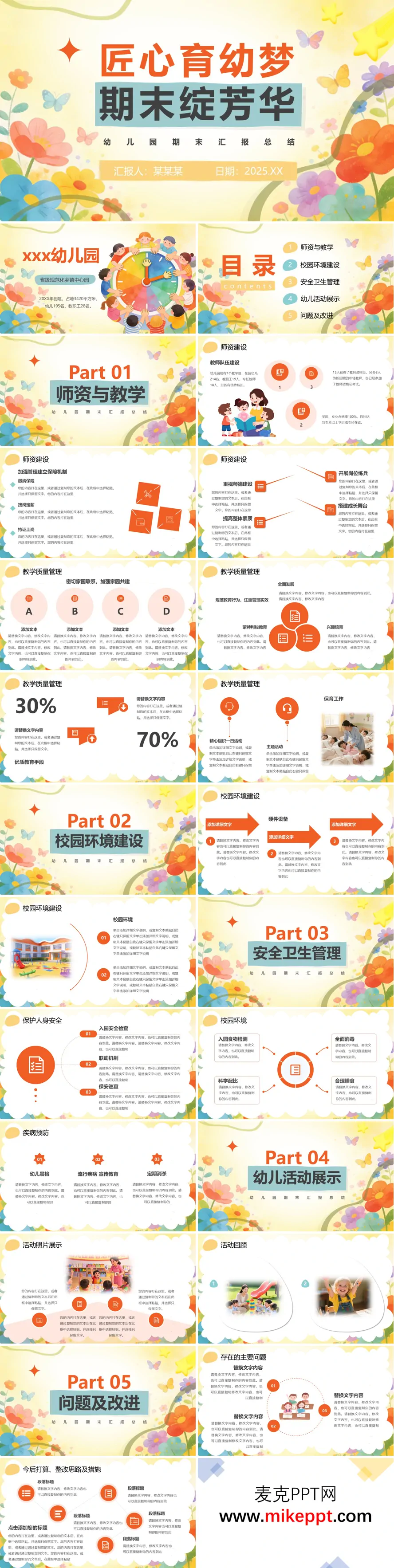 这套PPT以“匠心育幼梦,期末绽芳华”为主题,系统总结了XXX幼儿园本学期的各项工作。整体结构清晰,内容涵盖全面,主要分为五大板块:师资与教学、校园环境建设、安全卫生管理、幼儿活动展示以及问题与改进。 在师资与教学部分,PPT重点展示了幼儿园的教师队伍建设成果,包括教师资格证持有情况、学历水平、师德建设以及通过岗位练兵等活动提升教师专业素养的措施。同时,也提及了规范教育行为、开展主题活动、密切家园联系等教学质量管理方面的实践。 校园环境建设部分强调了硬件设施的完善与优化,为幼儿提供了良好的学习和生活空间。安全卫生管理是汇报的另一核心,内容细致入微,涵盖了从入园安检、保安巡查、食品检测到疾病预防(如晨检、定期消杀)等多个环节,体现了对幼儿健康安全的高度重视。 此外,PPT预留了幼儿活动展示板块,用于呈现孩子们丰富多彩的在园生活。最后,汇报以发现问题、展望未来的反思环节收尾,展现了幼儿园持续改进、追求卓越的决心。整体而言,这份总结报告图文并茂,框架完整,较好地反映了幼儿园一学期来的工作亮点与成效。