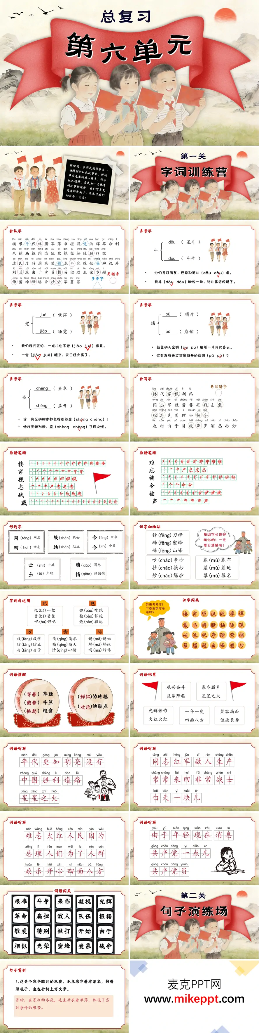这套小学第六单元总复习课件以红色主题为鲜明主线,创新采用"闯关进阶"形式,将革命传统教育与语文能力训练有机融合,系统构建起立体化复习体系。 第一关"字词训练营"筑牢语言根基,全面覆盖会认会写字,精准辨析多音字"斗""觉"在不同语境中的读音,聚焦易错笔画与形近字的细微差别。通过"穿着草鞋"等革命情境短语强化词语搭配,有序积累艰苦奋斗类成语,在听写挑战与识字闯关中夯实字词基础。 第二关"句子演练场"提升表达能级,深度赏析课文中毛主席、周总理等革命领袖的人物描写佳句,感悟语言魅力。开展"每当……就……""一边……一边……"等句式仿写训练,熟练掌握"把"字句与"被"字句的转换规律,同步积累立志名言,在品读与实践中增强句子运用能力。 第三关"课文回望亭"传承红色基因,全景式梳理《八角楼上》《朱德的扁担》《难忘的泼水节》等经典革命题材课文,引导学生深入领会艰苦奋斗、亲民爱民等崇高精神品质,准确把握课文主旨内涵,厚植爱国情怀。 第四关"写作展示台"聚焦应用实践,细致指导留言条写作的格式规范,从称呼、正文到署名日期逐项明确要求,搭配范例解析与梯度练习,培养学生实用文体的规范写作能力。整体设计以红色文化情境贯穿始终,既强化基础训练,又注重人文感悟,助力学生在系统复习中实现知识内化与精神成长。
