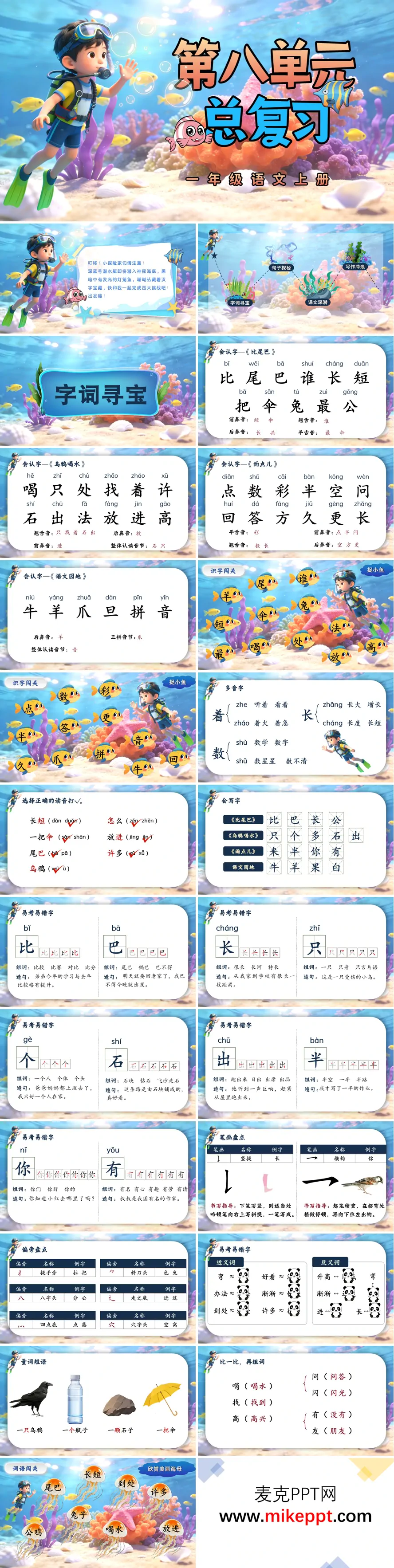这份一年级语文上册第八单元总复习PPT,以“字词寻宝—句子探秘—课文深潜—写作冲浪”四段航程,把《比尾巴》《雨点儿》和语文园地的知识点变成一次海底探宝般的趣味旅行。字词港口先亮出“宝箱”:会认会写“比、巴、只、出”等生字,用“魔法放大镜”逐笔演示易错笔画;多音字“着、长”坐上“读音小火车”,学生点击车厢即可听到不同发音;部首、笔画、近反义词被做成“贝壳卡片”,捡对一张就能听到海浪掌声;量词短语“一条尾巴、一朵雨点儿”用拖拽游戏归位,老师一声“字词闯关开始”,孩子们边玩边把基础夯实得扎扎实实。句子探秘谷里,“一问一答”“比喻句”“‘更’字句”三条句式隧道依次亮起:先出现“谁的尾巴长?”“猴子的尾巴长。”学生戴头饰分角色朗读,再仿写“谁的耳朵大?”;比喻句用“尾巴像扇子”配图,让学生补写“雨点儿像……”;“更”字句用对比动画“大雨点儿比小雨点儿落得更快”,学生跟说“我比小树长得更高”,句式在欢笑中自然迁移。课文深潜区用“海底望远镜”回看文本:《比尾巴》中动物尾巴功能被做成“翻翻牌”,翻出猴子“长”、兔子“短”、松鼠“好像一把伞”,学生边翻边做动作;《雨点儿》则用“雨点路径图”梳理大雨点儿去有花的地方、小雨点儿去有草的地方,逻辑一目了然;节日祝福语格式和“日积月累”被装进“贝壳广播站”,学生模拟播送“中秋快乐、国庆快乐”,口头表达悄悄升级。最后的写作冲浪滩,大屏呈现雨点儿落在伞面、荷叶、水坑的三格漫画,老师给出“时间、地点、动作、心情”四把钥匙,学生口头组句再写下“雨点儿落在______,我______”的创意写话,优秀作品即时贴上“彩虹展示墙”,家长扫码就能听到孩子稚嫩的朗读。整套资料用宝箱、望远镜、小火车、彩虹墙把字、词、句、篇、写话串成一条看得见、摸得着、玩得转的复习航线,既紧扣教材,又贴合低年级孩子的认知特点,让期末复习像一次轻松愉快的海底探险。