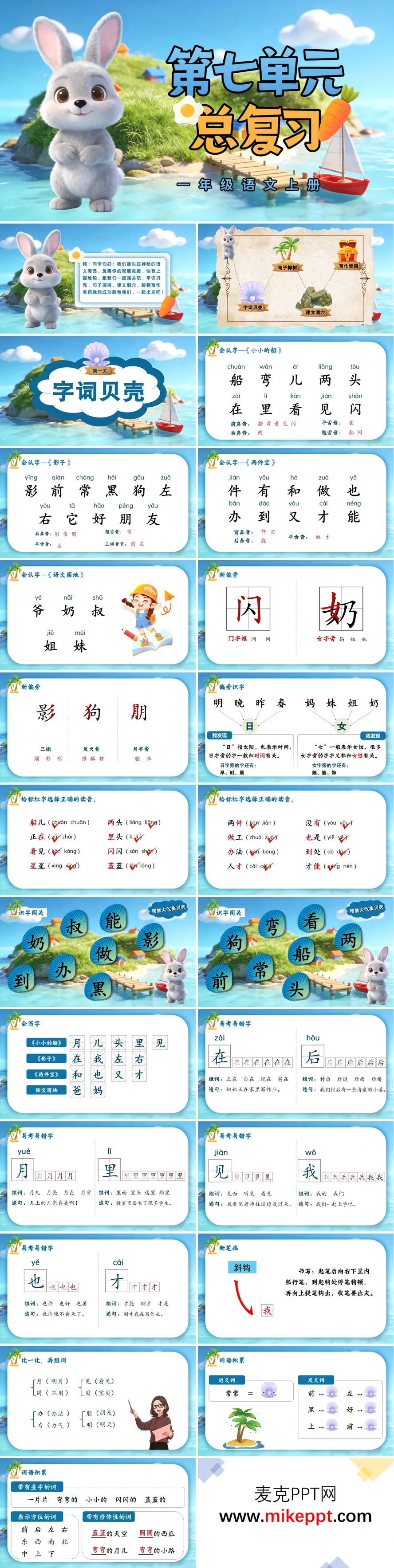 这份一年级语文上册第七单元总复习PPT,把枯燥的复习变身成一次“海洋探险”——孩子们捡“字词贝壳”、爬“句子椰树”、探“课文洞穴”、开“写作宝箱”,在椰风海韵中把知识装进小背篓。第一站“字词贝壳滩”:《小小的船》《影子》《两件宝》的会认会写字被装进五彩贝壳,点击“船”字贝壳出现小帆船动画,笔顺逐笔漂过;“日”“女”字旁做成“阳光贝”“公主贝”,拖拽归类即可听到海浪掌声;方位词“前、后、左、右”用“影子踩点”游戏,孩子根据屏幕提示把影子贴到正确位置,边玩边理解;叠词“弯弯、小小、闪闪”用“回声海螺”跟读,回声越大奖励越多的“珍珠积分”,字词在欢笑中扎根。第二站“句子椰树”:椰树上挂满比喻句果实,“弯弯的月亮像小船”用动画演示月亮变船,学生口头仿写“闪闪的星星像____”,椰子落下即可出现参考答案,生动句式在轻松互动中被孩子带走。第三站“课文洞穴”:《小小的船》用“星空隧道”带孩子飞月亮,跟读“我在小小的船里坐”,感受诗意画面;《影子》用“阳光小舞台”演示影子前后左右变化,学生扮演“影子”随音乐移动,体会“影子是我的好朋友”;《两件宝》用“手脑机器人”展示“用手又用脑,才能有创造”,孩子边拍手边念儿歌,道理铭记于心;方位辨别儿歌用“海盗寻宝图”巩固,“向前三步、向左两步”找到宝藏,课文内容在游戏中反复再现。第四站“写作宝箱”:宝箱内藏“看图写话”三格图——小朋友在海边捡贝壳,老师给出“时间、地点、谁、干什么、心情”五把钥匙,学生口头说句再写下“夏天,我们在海边捡贝壳,真高兴!”等简单句,写完后宝箱开启,优秀作品化作“金色贝壳”贴上展示墙,家长扫码即可听到孩子朗读。整套资料用贝壳、椰树、洞穴、宝箱四连环,把比喻句、方位词、叠词、写话串成一条趣味探险链,既紧扣教材,又贴合低年级兴趣,让期末复习变成一次轻松愉快的海岛之旅。