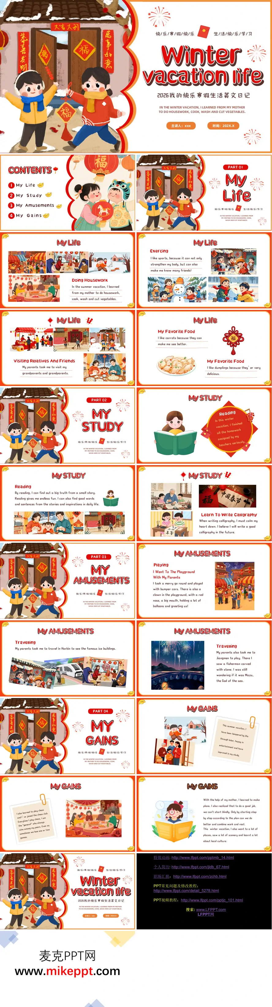 这套以"2026快乐寒假生活"为主题的英文PPT,整体设计洋溢着浓浓的节庆氛围与童真童趣。设计师巧妙运用喜庆的红橙配色方案,并融入春节传统插画元素,从视觉上就营造出温暖欢快的年味,令人眼前一亮。 作品以"我的寒假生活"为主线,精心划分为四个核心板块:My Life、My Study、My Amusements和My Gains。在"My Life"篇章中,作者用生动的图文记录了自己跟随妈妈学习做家务的点点滴滴,展现了坚持运动的自律精神,描绘了走亲访友的热闹场景,还特别分享了对胡萝卜、饺子等传统美食的喜爱之情。转而至"My Study"板块,作者展示了认真完成假期作业的学习态度,记录了阅读过程中积累优美词句的心得体会,以及练习书法时的专注与收获,体现了劳逸结合的生活智慧。 "My Amusements"部分则充满了欢声笑语,既有与父母同游游乐场、体验碰碰车刺激的温馨时光,也有远赴哈尔滨欣赏精美冰雕、前往江门领略渔家雕刻艺术的难忘旅行见闻。最后的"My Gains"板块,作者真诚反思了寒假中的成长与收获,从学会制定科学计划到在对弈中锻炼逻辑思维,每一个感悟都闪耀着独立思考的光芒。 整体来看,这套PPT通过图文结合的创新形式,真实立体地呈现了一个充实快乐且富有意义的寒假生活。它不仅是一份优秀的学生假期总结展示作品,更是一份兼具生活气息与英语学习价值的实践成果,充分展现了当代青少年的多元发展与综合素养。