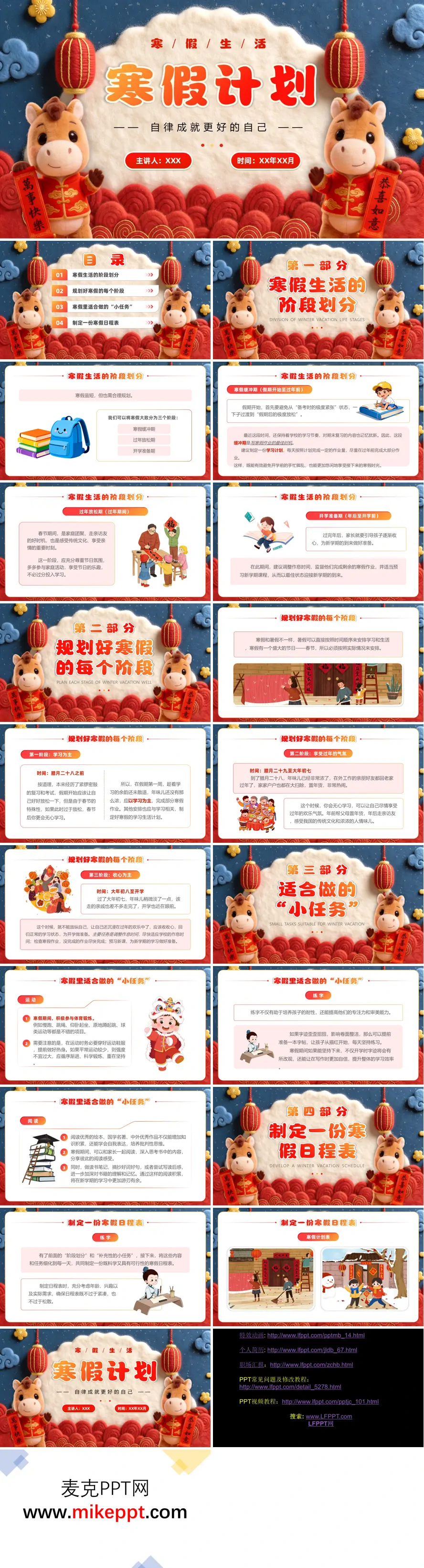 这套以"自律成就更好的自己"为主题的PPT,特别采用了马年新春毛绒质感的创意设计,巧妙融入红灯笼、祥云等传统节庆元素,整体视觉洋溢着温馨祥和的节日气息。 内容架构上,该作品聚焦寒假规划管理,精心设置了四大核心板块。首部分"寒假生活的阶段划分",将假期科学拆解为"缓冲调整期""过年放松期""开学预备期"三个递进阶段,为每个时期明确界定核心任务与目标导向。第二部分"规划好寒假的每个阶段"则进一步细化执行方案:腊月二十八前侧重学业巩固与知识梳理,腊月二十九至大年初七全身心投入新春佳节氛围,大年初八至开学则逐步收心、温故知新。 第三部分"适合做的'小任务'"提供了一系列切实可行的假期充实建议,涵盖体育锻炼以强健体魄、练习书法以修身养性、坚持阅读以开阔视野等多元选择。最后的"制定一份寒假日程表"板块,则系统指导如何将宏观的阶段规划与具体的任务清单,转化为精细化、可操作的每日时间安排,确保寒假生活张弛有度、收获满满。 整体而言,这套PPT将教育理念与实践工具完美结合,既注重培养青少年的自我管理能力,又充分考量假期生活的特殊性,实现了趣味性与实用性的有机统一。它不仅是家长辅导孩子科学规划假期的得力助手,更是引导学生建立自律意识、实现自我提升的优质素材,具有较高的应用价值与推广意义。