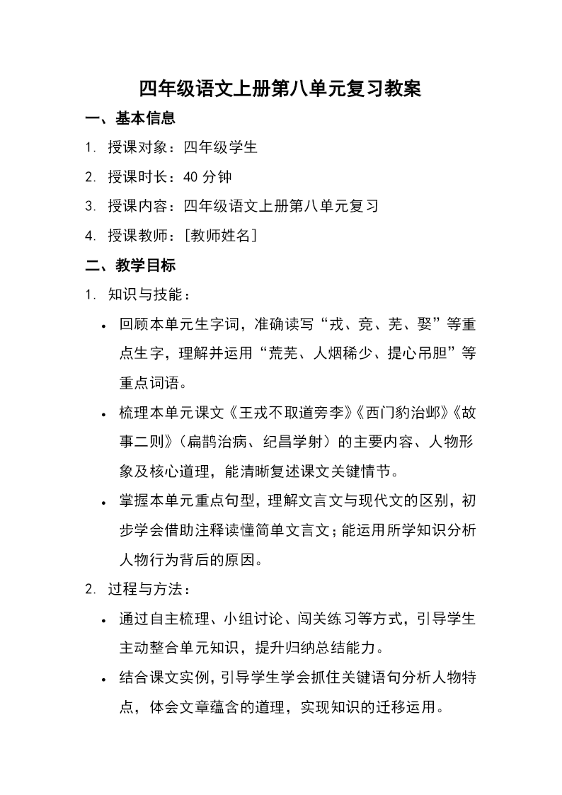这份四年级语文上册第八单元复习PPT以“历史人物故事”为主线,将全套内容包装成一场“四关闯关”的探秘之旅,让学生在“闯—练—悟—写”的节奏中把字词、句式、课文与习作一网打尽。第一关“字词溯源”是入场热身:会认会写字被做成“竹简碎片”,学生拼齐后方可解锁下一关;多音字“折、将”用“兵符选择”区分读音;形近字“戎—戒、豹—豺”放进“识字加油站”,系统动画演示偏旁差异;近反义词用“锦囊匹配”,拖对即弹出“恭喜通关”,基础积累在闯关中悄悄完成。第二关“句式研磨”升级难度:双重否定句改陈述句用“磨刀石”打磨,例句“不得不”被锤子敲碎成“只得”;“长话短说”用“删改剪刀”,学生动手剪掉修饰语、把直接引语换成间接引语,秒懂“简洁”魅力;动作、神态描写句用“放大镜”赏析,如“西门豹皱了皱眉”,学生圈出动词并仿写“王戎摸了摸胡子”,语言表达立刻生动。第三关“文典深悟”进入故事核心:《王戎不取道旁李》用“文言注释地图”逐句解锁,学生拖动注释到对应字词,系统亮灯通过;课文脉络用“情节阶梯”展示“见李—不取—问之—答曰”,孩子拾级而上复述故事;《西门豹治邺》用“智慧流程图”呈现“调查—除巫—开渠”,重点句“麻烦您去跟河神说一声”用角色扮演朗读,学生代入感受“将计就计”的机智;人物档案卡归纳“王戎善观察、西门豹勇谋略”,启示栏弹出“冷静思考、敢于破除迷信”,价值引领水到渠成。第四关“作文怀”是终极挑战:习作任务“讲历史人物故事”被拆成“选材—构思—细节—表达”四步,示例《蔺相如完璧归赵》用“故事山”模板起承转合,提供“凤头豹尾”锦囊——开头设悬念、结尾点启示,学生现场完成“故事卡片”,优秀习作配上人物插图张贴在“历史长廊”,扫码即可听作者朗读。整套资料用竹简碎片、磨刀石、智慧图、故事山四连环,让字词有源头、句式有打磨、人物有深度、习作有支架,助力学生在闯关激情中系统掌握单元知识,提升读写综合素养。
