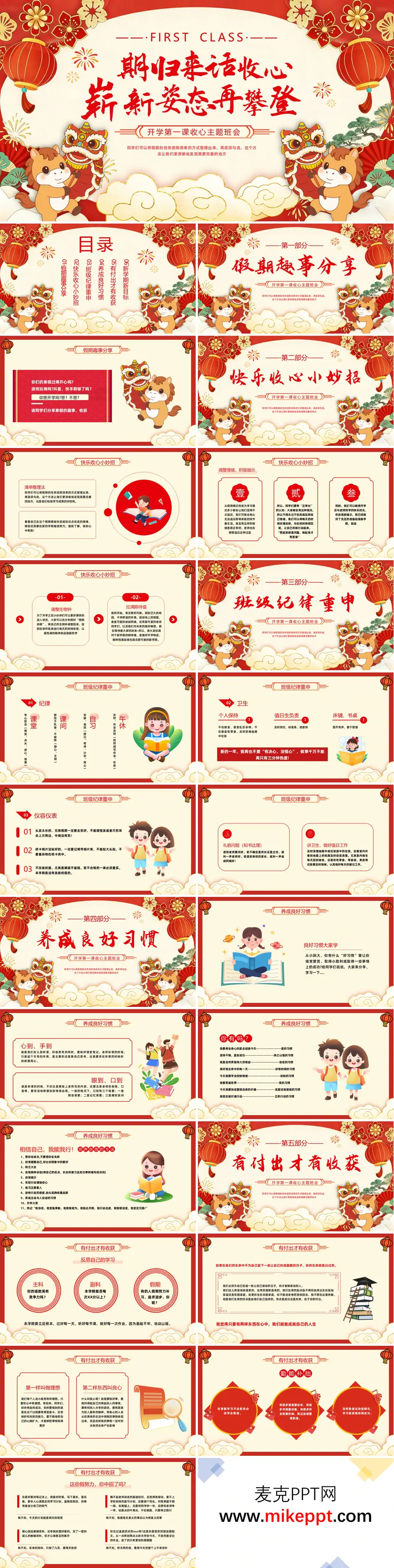 这套专为开学第一课精心设计的收心主题班会PPT,整体采用红金双色的经典搭配,融合马年新春特有的插画艺术风格,通过烟花绽放、祥云缭绕、灯笼高挂等视觉元素的巧妙点缀,营造出既喜庆又温馨的浓厚氛围。 内容体系围绕"收心归位、迎接新学期"这一核心主线,科学划分为六大递进式板块。在"假期趣事分享"环节,课件通过设置互动性提问,巧妙引导学生主动回顾并分享假期中的精彩瞬间,在轻松愉快的氛围中开启班会序幕。"快乐收心小妙招"板块则提供了一系列极具操作性的过渡方法,包括清单整理法、渐进式作息调整等实用技巧,帮助学生平稳地从假期休闲状态切换至学习模式。 第三板块"班级纪律重申"从课堂秩序、卫生习惯、仪容仪表等多个维度,系统梳理并明确班级规章制度,强化学生的规则意识与集体观念。"养成良好习惯"部分则创造性地提炼出"心到、手到、眼到、口到"的四到学习法则,从专注力、执行力、观察力、表达力全方位培养良好学习习惯。第五板块"有付出才有收获"紧密结合学习反思与成长感悟,通过典型案例与励志故事,有效激发学生的内在动力与奋斗精神。最后的"新学期新目标"板块,则引导学生运用SMART原则制定具体可行的新学期规划,以目标导向引领行动方向。 整体而言,这套PPT设计思路清晰,内容编排既有理论高度又贴近学生实际,互动性强且实用价值突出,能够有效提升班会的参与度与实效性,是班主任开展开学收心教育的优质教学资源与得力助手。