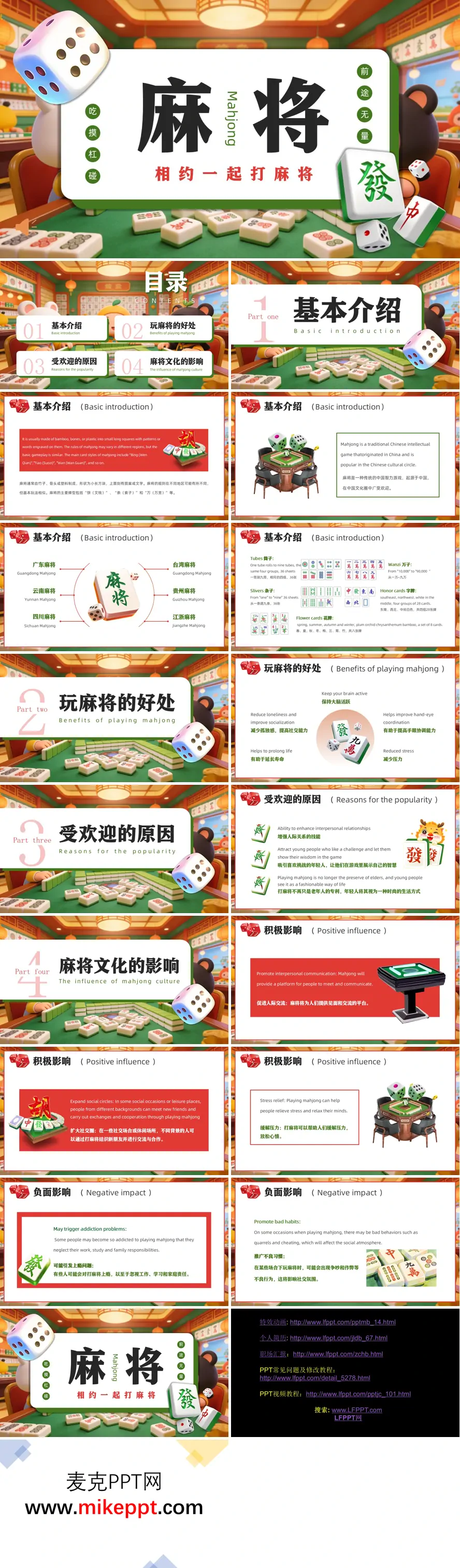 这套PPT以“麻将”为主题,从四个部分系统介绍了麻将的基本知识、益处、流行原因及其文化影响。整体风格简洁,图文并茂,核心信息突出。 第一部分“基本介绍”阐述了麻将的起源、材质和基本牌型。PPT指出麻将是起源于中国的传统智力游戏,通常由竹、骨或塑料制成,并详细展示了三种基础牌型——“筒子”、“条子”、“万子”,以及“字牌”和“花牌”的构成与数量,为读者构建了麻将的基本认知框架。 第二部分“玩麻将的好处”从身心健康角度列举了多项积极影响,包括保持大脑活跃、减少孤独感、提高社交能力、延长寿命、改善手眼协调以及缓解压力。这部分内容强调了麻将不仅是一种娱乐,更是一种有益身心的活动。 第三部分“受欢迎的原因”分析了麻将如何突破年龄界限,从传统的老年人活动转变为吸引年轻人的时尚社交方式。PPT认为其挑战性和智慧展示的特质,以及促进人际关系的功能,是其持续流行的关键。 第四部分“麻将文化的影响”则进行了辩证分析。既肯定了其在促进交流、扩大社交圈和舒缓压力方面的积极作用,也客观指出了可能引发的成瘾问题以及赌博、争吵等不良行为带来的负面影响,体现了较为全面的思考。