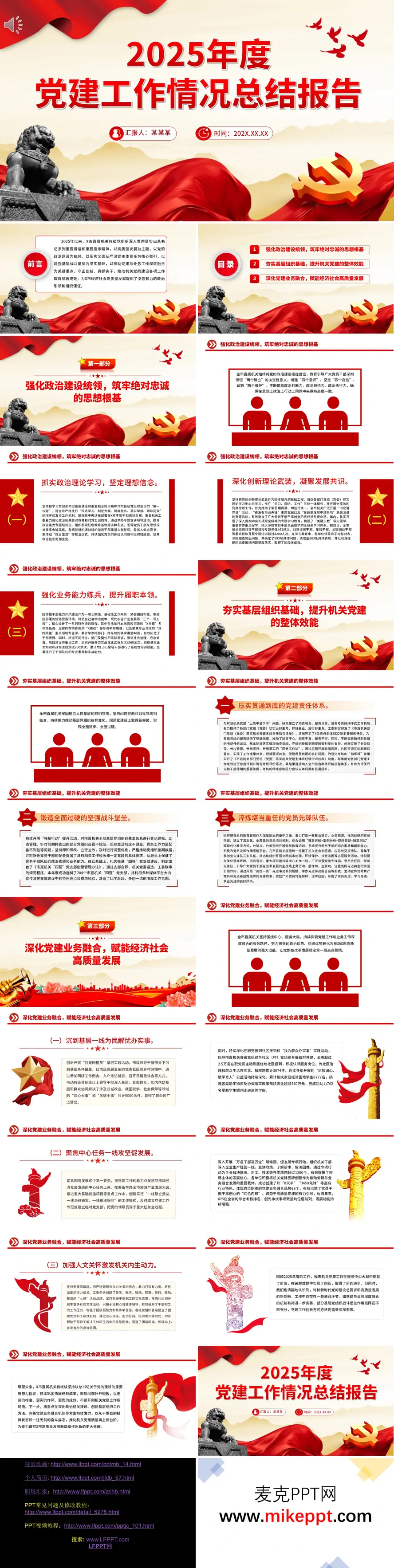 这套专为2025年度党建工作总结精心打造的专业汇报PPT,以经典红金配色为视觉基调,巧妙融入石狮、红旗、党徽等标志性党建元素,整体呈现出庄重而不失活力的严谨氛围,充分彰显党建工作特有的严肃性与使命感。 报告内容体系完整、结构严谨,围绕三大核心板块层层递进展开论述。第一板块聚焦政治建设统领作用,通过深化政治理论学习、强化创新理论武装、开展业务能力练兵等系统性举措,详细阐述了如何筑牢党员绝对忠诚的思想根基,持续提升履职本领,广泛凝聚思想共识,为机关发展提供坚强政治保证。第二板块着眼基层组织基础功能,从压实党建责任体系、锻造坚强战斗堡垒、淬炼党员先锋队伍三个关键层面切入,全面展示了基层组织建设的扎实成效、创新做法与特色亮点。第三板块突出党建业务深度融合,紧紧围绕"沉到基层一线为民解忧办实事、聚焦中心任务一线攻坚促发展、加强人文关怀激发机关内生动力"三个实践维度,生动呈现了党建引领赋能经济社会高质量发展的具体成果与宝贵经验。 整套汇报材料逻辑严密、层次分明、内容详实、数据精准,既全面客观总结了过去一年的工作成效与特色品牌,又为新时代党建工作的高质量发展指明了前进方向、提供了实践遵循,是各级机关单位开展党建述职评议、经验交流推广的优质范本和权威参考。
