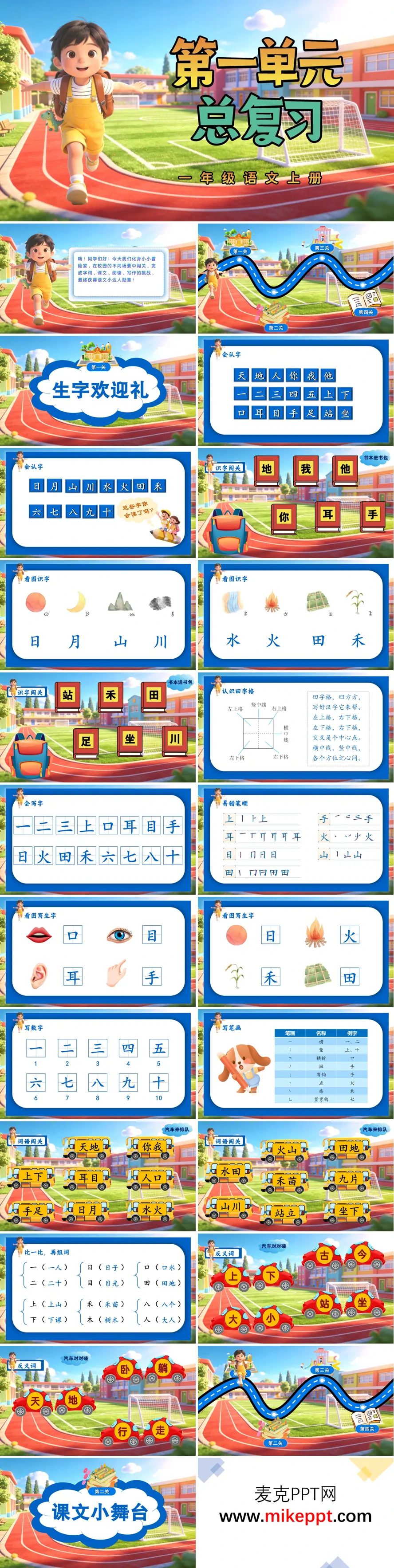 这份一年级语文上册第一单元总复习PPT,把枯燥的复习包装成一场“小小探险家闯关”游戏:学生化身勇士,一路闯过生字大峡谷、课文丛林、阅读山峰和写话城堡,边玩边把“天、地、人”到“看图写话”全收入背包。第一关“生字大峡谷”里,“天、地、人”等20个会认字做成“闪光宝石”,“一、二、上”等10个会写字化作“阶梯石板”,孩子用“看图识字”望远镜认读,用“魔法笔”跟写笔顺,写对即可听到“叮咚”升级音;“比一比组词”让“大—小”反义词玩“对对碰”,组词成功宝石自动飞入背包,字词在欢笑中扎根。第二关“课文丛林”:节奏儿歌《金木水火土》用“五行转盘”拍手跟读,《咏鹅》用“白鹅游水”动画伴唱,学生边做动作边背诗;拓展《剪窗花》用“窗花拼图”把“红纸、剪刀”拖进正确位置即可出现窗花图案,“站如松”等谚语用“小军人”示范站姿,数字诗用“跳房子”节奏读,积累在律动中完成。第三关“阅读山峰”:“快乐阅读”理解题用“登山台阶”出现,每答对一题台阶上升,直至登顶;“我说你做”口语交际用“指挥官”发令,“请拍手、请转圈”必须大声说、专注听,完成即可得“专注星”,表达与倾听双提升。第四关“写话城堡”:城堡大门出现“看图写话”三格图——小朋友在公园放风筝,老师给出“时间、地点、人物、事件”四把钥匙,学生口头说句再写下“春天,我们在公园放风筝,真开心!”等简单句,写完后城门开启,优秀作品化作“探险徽章”贴上展示墙,家长扫码即可收听。整套资料用宝石、转盘、台阶、徽章四连环,把生字、背诵、口语、写话串成一条游戏化探险链,既紧扣教材,又贴合低年级兴趣,让期末复习变成一次轻松愉快的大冒险。