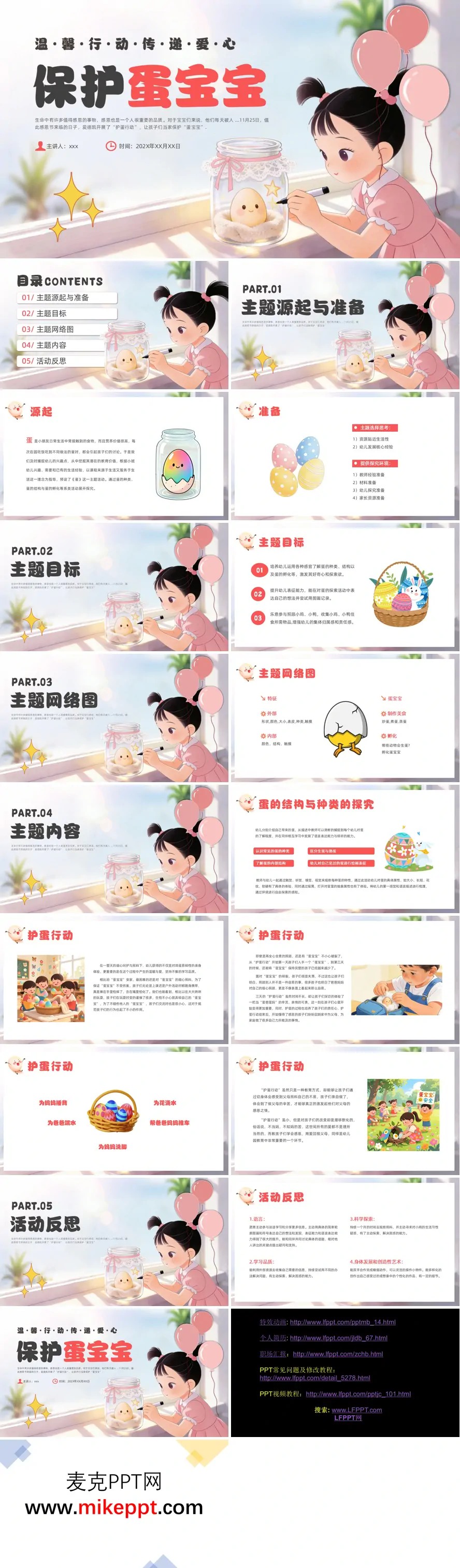 这套PPT以“护蛋行动”为主题,生动呈现了幼儿园如何通过保护蛋宝宝的活动培养幼儿的感恩意识与责任感。内容结构清晰,分为主题源起、目标设定、网络规划、活动实施与反思五个部分。 主题源于幼儿日常对蛋类的兴趣,教师敏锐捕捉教育契机,围绕蛋的种类、结构及孵化设计探究活动。活动目标明确,注重多感官体验与表达能力培养,鼓励幼儿用图画记录发现,并在照顾小动物的过程中增强责任感。主题网络图系统梳理了蛋的外部特征、内部构造、美食制作及孵化过程等探索方向。 活动内容详实有趣,从认识不同蛋类、观察结构到开展为期三天的“护蛋行动”,孩子们全程投入。他们为蛋宝宝安家,随身携带呵护,在小心翼翼的行为中学会责任与关爱。尽管部分蛋宝宝不慎破裂,孩子们却从中体会到父母照顾自己的不易,进而主动回家为父母捶背、端水,甚至为妈妈洗脚:。这些温馨举动如浇花、帮推车等,体现了感恩教育的潜移默化。 活动反思部分总结了幼儿在语言表达、学习品质、科学探索及动手能力方面的显著进步。整个PPT通过真实的活动场景与情感升华,生动诠释了“温馨行动传递爱心”的核心价值,彰显了寓教于乐的教育成效。