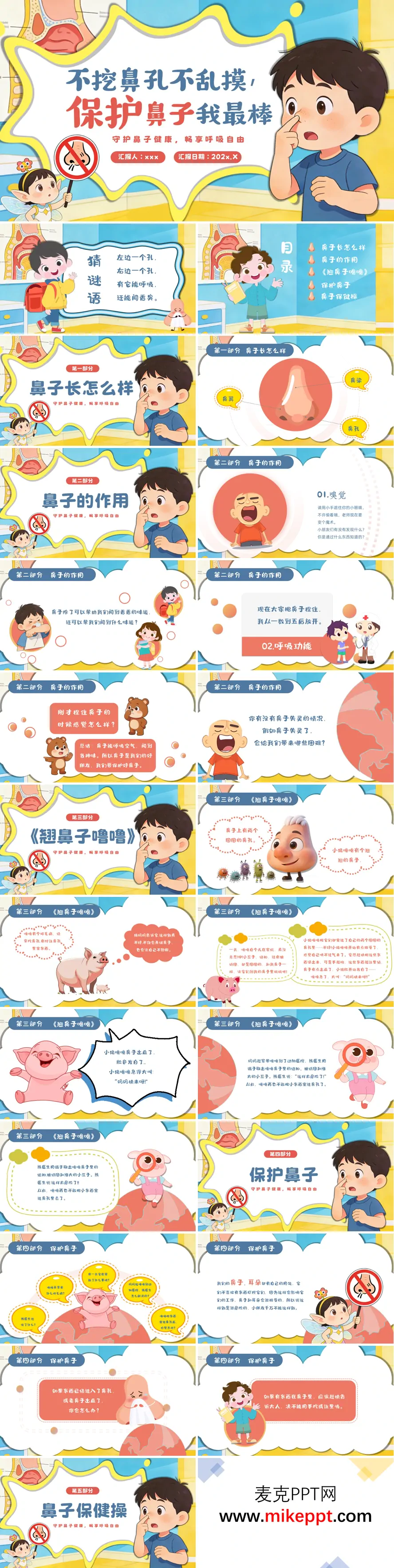 这套PPT以“守护鼻子健康,畅享呼吸自由”为主题,围绕幼儿健康教育设计,内容循序渐进、生动有趣。整体分为五个部分,通过图文并茂的方式,引导小朋友认识鼻子、了解鼻子的功能,并学习如何保护鼻子。 第一部分引导小朋友观察鼻子的外形结构,认识鼻梁、鼻翼和鼻孔等部位。第二部分通过互动小游戏,如“遮眼闻气味”“捏住鼻子呼吸”,让小朋友亲身体验鼻子的两大功能——嗅觉和呼吸,并思考如果鼻子失灵会带来哪些困难。第三部分通过《翘鼻子噜噜》的绘本故事,讲述小猪噜噜因挖鼻孔和往鼻子里塞豆子、纽扣等异物,导致鼻子出血、呼吸困难的危险经历,最后由熊医生救治,警示小朋友不要往鼻子里乱塞东西。第四部分通过问答形式,回顾故事内容,强调保护鼻子的重要性,并教育小朋友遇到异物入鼻或流鼻血时应及时告诉大人。最后一部分以朗朗上口的儿歌形式教小朋友做“鼻子保健操”,巩固“不挖鼻孔、不乱塞东西、用纸擦鼻涕”等卫生习惯。 整套PPT内容贴近幼儿认知,兼具知识性、趣味性和教育性,能有效帮助幼儿树立保护鼻子的意识。