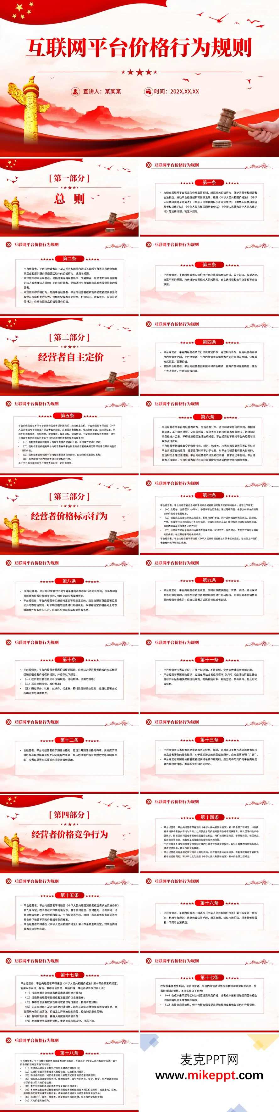 这套以"互联网平台价格行为规则"为主题的政策解读PPT,整体选用红金双色为主基调,巧妙融入法槌、华表等象征法治与权威的标志性元素,共同营造出严谨专业、庄重权威的宣讲氛围,充分体现了政策文件的严肃性与指导性。 内容编排上,该宣讲材料严格遵循规则原文的框架体系,系统划分为六大核心板块。开篇"总则"部分清晰阐明规则的立法背景、制定依据及适用范围,为后续解读奠定法理基础;"经营者自主定价"板块明确界定平台与商家的定价权利边界,在保障市场活力的同时划定合法合规底线;"价格标示行为"规范聚焦标价内容的真实性、格式的标准化以及促销信息的透明化要求,着力推动价格信息阳光化;第四部分"价格竞争行为"则明确禁止低价倾销、价格欺诈、价格歧视等扰乱市场秩序的不正当竞争行为,维护公平竞争环境;第五板块"消费者权益保护"从法律层面强化消费者的知情权、选择权与公平交易权,筑牢消费者合法权益防护网;最后的"监督机制"则清晰界定监管部门的职责权限,畅通投诉举报渠道,并明确各类违规行为的法律责任与处罚标准。 整套PPT逻辑严密、条分缕析,既注重政策理论的精准传达,又兼顾实务操作的具体指引,无论是监管部门开展专题培训,还是平台商家组织内部合规学习,均能提供权威、系统、实用的参考依据,是推进互联网平台价格行为规范化建设的优质宣讲工具。