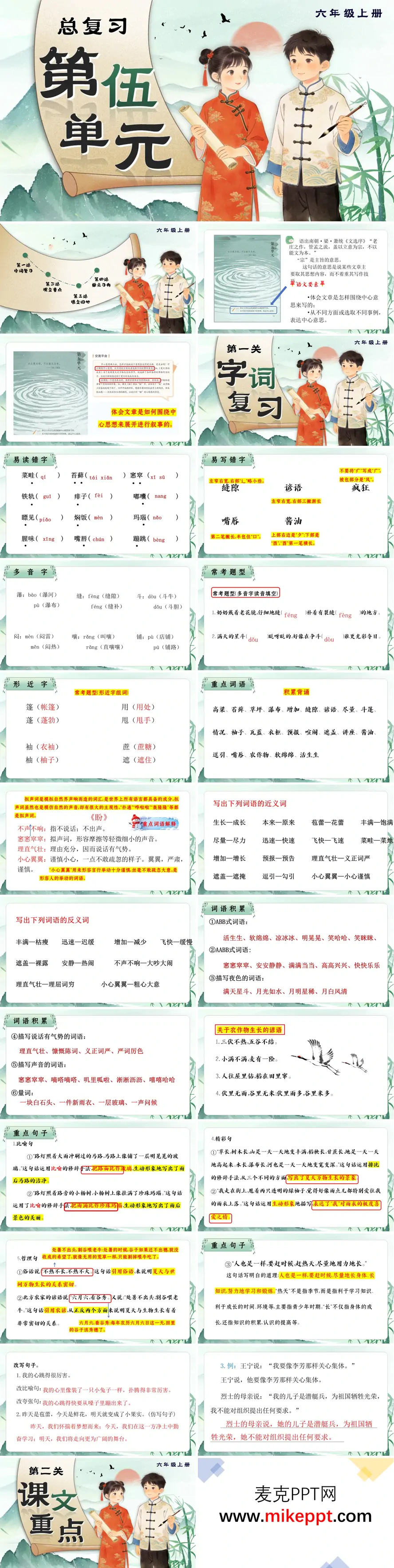 这是一套专为六年级上册语文单元复习定制的教学课件,以清新淡雅的国风插画为视觉基调,紧扣"夏天的成长""盼"等核心课文,构建起知识梳理与趣味互动相融的完整学习链。课件开篇即用灵动画面营造夏日氛围,自然唤醒学生的学习期待。 字词夯基模块设计精当,多维突破重点难点:针对"菜畦""铁轨"等易读错写错的词汇,结合字形溯源与错误归因进行精准辨析;围绕"缝""斗"等多音字,通过创设生活化语境让学生在具体场景中领悟音义对应关系;同步设置近反义词配对、ABAB式叠词仿写、摹写声音象声词等梯度练习,盘活词汇积累;更巧妙融入"三伏不热,五谷不结"等农谚,将语言学习与传统农耕文化链接,增添知识的厚度与温度。 课文精讲环节聚焦《夏天里的成长》《盼》两篇典范,采用"句段赏析—手法探究—主旨升华"的递进路径:精选"人也是一样,要赶时候,赶热天,尽量地用力地长"等关键句,引导学生品味比喻、拟人修辞的精妙,梳理"万物生长—人生感悟"的叙事逻辑,体悟文本托物言志的深层意蕴;通过"盼"的心理活动细读,学习以细节传情的写作匠心。配套设置句式转换、病句诊疗等专项训练,并剖析高频考点答题思路,实现能力迁移。 写作提升板块则锚定"围绕中心意思写"这一核心目标,借助范文拆解与选材构思练习,指导学生掌握"选取典型事例、铺排不同侧面、服务统一主题"的谋篇策略。整份课件讲练结合、文化浸润与应试能力并重,是高效达成单元复习目标的优质教学支架。