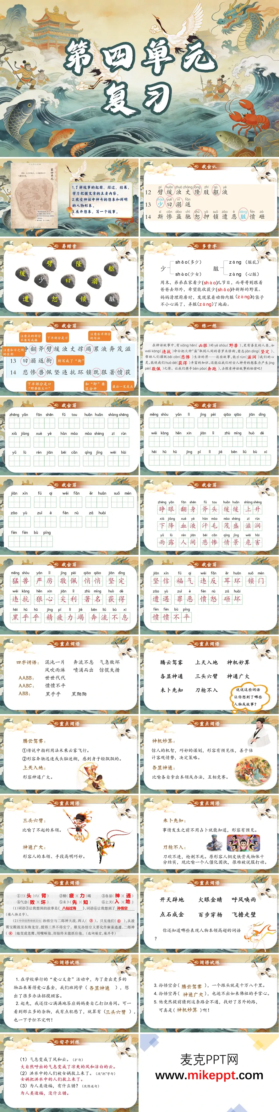 这份四年级语文第四单元复习PPT以“神话”为主题,把字词、句子、课文与写作四块知识打造成一座“众神之岛”,让学生踏着祥云、追着神光,在闯关冒险中完成基础巩固与想象腾飞。第一关“基础神殿”:生字“劈、浊、竭”化作“神兵碎片”,学生拼读正确即可重铸神器;多音字“少、脏”用“神音转盘”切换读音,易错字笔顺用“雷火电光”逐笔演示;四字词语“腾云驾雾、震天动地”被装进“仙术锦囊”,释义配动画,学生选词说话即可激活“法术”,积累在欢乐中完成。第二关“课文圣域”:《盘古开天地》用“混沌—劈—撑—化”流程图,学生贴图复述天地形成;《精卫填海》用“东海地图”标注“发鸠山—东海”,填海动画演示“衔木石—投水”,人物分析卡归纳“顽强不屈”;扩句练习把“精卫投石”升级为“精卫衔着细小的树枝,猛地投向波涛汹涌的东海”,学生用“放大镜”添动作、添环境,句子瞬间立体。第三关“句式修炼”:改写把“太阳升起”变“太阳跳出山巅”,扩句用“神灯”加动作、加修辞,学生边改边得“仙力值”,语言训练充满游戏感。第四关“写作天宫”:习作任务《我和孙悟空过一天》用“筋斗云思路图”——起因(相遇)—经过(三打白骨精/龙宫借宝)—结果(告别感悟),范文用“神笔示范”:开头“嗖!一朵云落在我窗前”设悬念,经过“我挥棒助阵,火星四溅”写场面,结尾“他拍拍我肩:勇气,就是你心中的金箍棒”点感悟;学生现场填写“思路云”,优秀习作配上“祥云边框”张贴在“天宫长廊”,扫码即可听作者朗读。整套PPT用神殿、圣域、修炼、天宫四连环,让神话不再停留在故事,而成为可读写、可想象、可创作的语文天地,既夯实基础,又点燃学生心中的“神笔”,助力他们在单元复习中“腾云驾雾”,抵达“语”众不同的精彩境界。