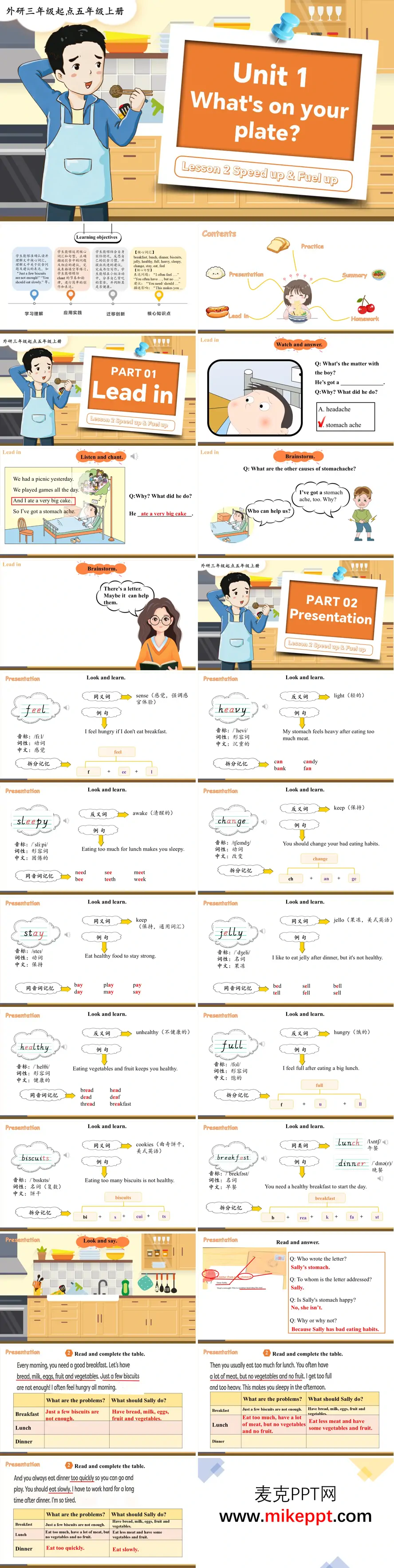 这是一套为外研版(二年级起点)五年级上册英语第一单元《What's on your plate?》定制的同步教学课件,以充满活力的橙黄色调为视觉主色,搭配生动可爱的卡通插画,营造温暖轻松的课堂氛围。课件整体设计遵循"情境触发—知识建构—能力迁移—素养深化"的递进逻辑,打造高效交互式的教学范式。 课程导入巧妙运用"胃痛"情景对话,通过角色代入自然引出"健康饮食"主题。词汇教学模块系统拆解feel、heavy、sleepy、change等核心词:采用音节拆分、同义联想(如heavy与full)、反义对比(如heavy与light)等多元记忆策略,结合生活化例句强化语境化运用;同步拓展biscuit、breakfast等主题关联词,构建词汇网络。 课文研读围绕"给Sally的一封信"展开多元解读:通过表格梳理不良饮食习惯的具体表现与危害后果,设计梯度化问题链引导学生提炼健康饮食建议,在真实语料中习得目标句型。练习环节设置单词拼写竞赛、句型框架填空、情景邮件写作等任务群,实现从机械操练到创造性输出的能力跃升;并融入食物金字塔可视化工具,深化学生对营养均衡理念的认知。 整份课件贯穿情景性、互动性、文化性原则,实现语言知识、思维品质与健康素养的有机融合,是实用性与趣味性兼备的优质教学资源。